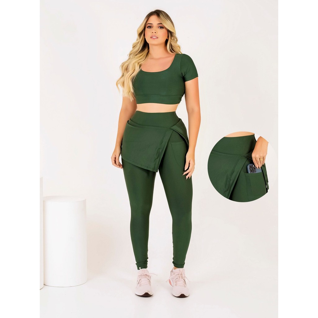 Conjunto Feminino Fitness Calça Saia Legging Com Bolso Top Cropped Moda Evangélica Treino Caminhada Ginástica Corrida