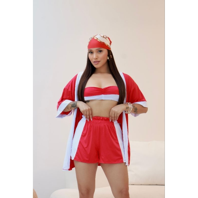 Conjunto Feminino Kimono, Top e Short Vermelho com Detalhes Brancos ❤️✨ Look moderno e confortável, perfeito para curtir o verão com estilo! Tecido leve e com ótimo caimento, ideal para usar na praia, piscina ou em passeios casuais. ✅ Tamanho único (36-44) ✅ Contém bojo ✅ Tecido suplex de alta qualidade ✅ Conjunto composto por kimono, top e short 🔥 Estilo, conforto e elegância em um só look!
