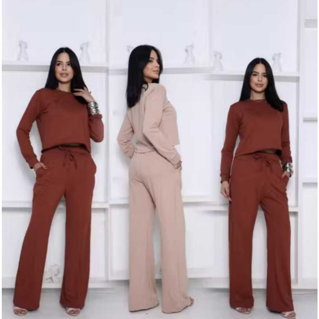Conjunto Feminino Moletinho de Inverno Blusa com Manga e Calça Pantalona Fashion