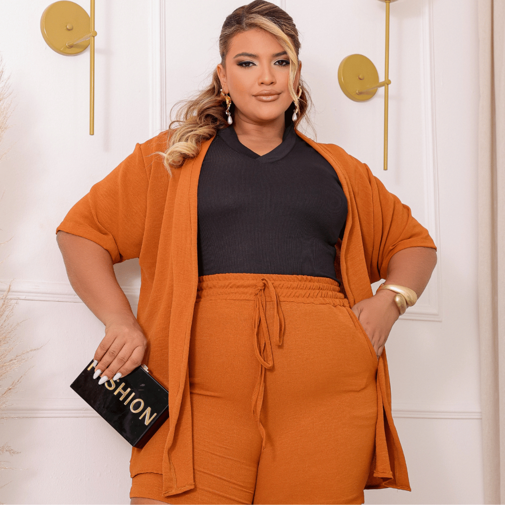 Conjunto Feminino Plus Size Crepe Dunas Kimono Cardigan E Short Moda Casual GG ao XG