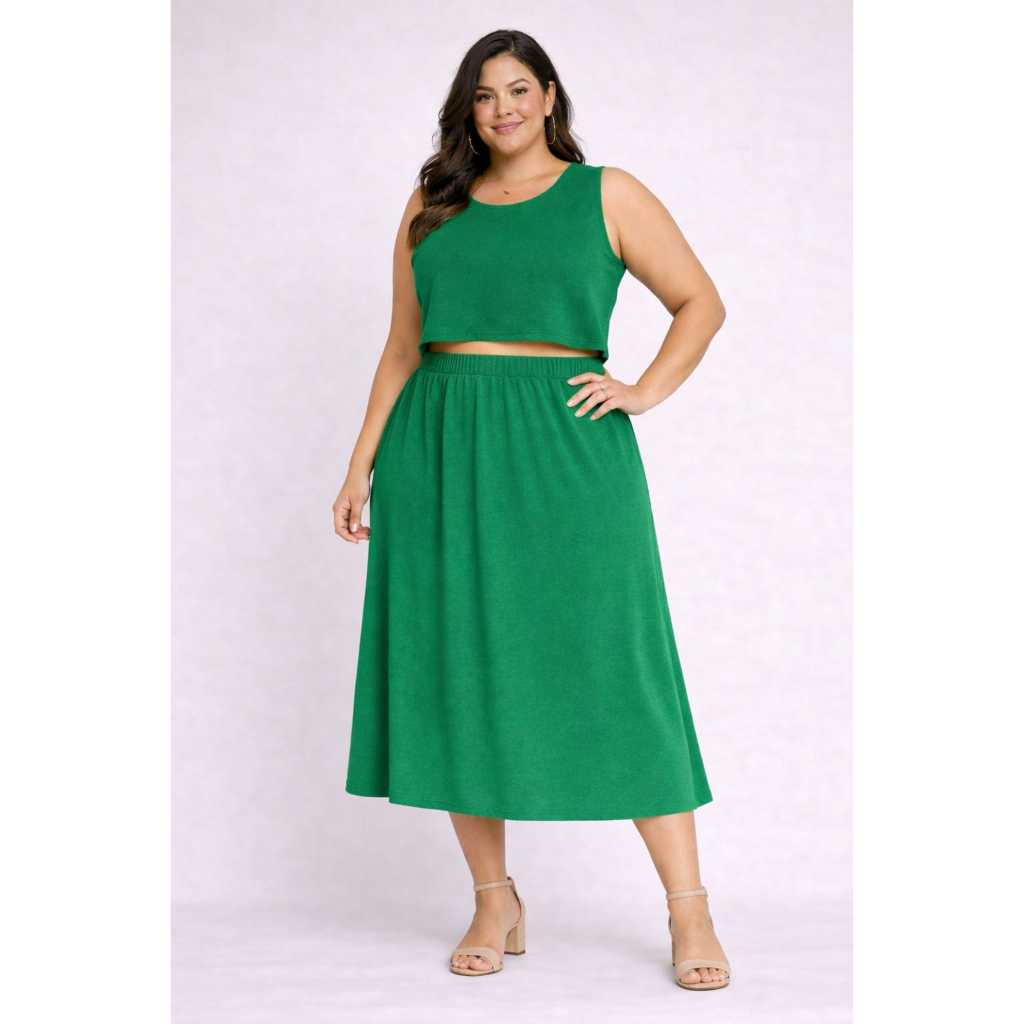 Conjunto feminino plus size composto por cropped regata e saia midi evasê com elástico na cintura, ideal para quem busca conforto, elegância e praticidade. Confeccionado em tecido leve estilo duna/crepe, com excelente caimento e toque macio, proporcionando um visual moderno e sofisticado. A saia não possui bolso, garantindo modelagem limpa e elegante. O cropped tem modelagem confortável que valoriza o corpo sem marcar. Perfeito para moda evangélica, dia a dia, igreja, passeio, trabalho ou eventos casuais. Modelo versátil que combina facilmente com sandálias, salto ou tênis. ✔ Veste do 46 ao 50 ✔ Modelagem confortável plus size ✔ Cintura com elástico ✔ Não possui zíper nem botões ✔ Produção prática e confortável