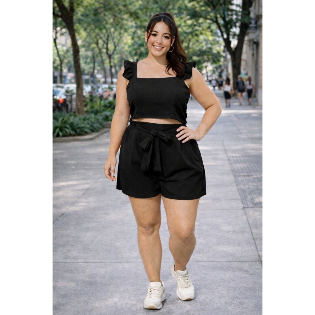✨ Conjunto Feminino Plus Size Cropped e Short com Amarração ✨ Garanta um look moderno, confortável e cheio de estilo com este conjunto incrível! Composto por top cropped com alças largas e babadinhos delicados e short cintura alta com faixa para amarração, é a escolha perfeita para realçar sua beleza em qualquer ocasião. ✔️ Modelagem Plus Size com caimento impecável ✔️ Tecido leve e confortável, ideal para dias quentes ✔️ Short de cintura alta que valoriza a silhueta ✔️ Cropped moderno com detalhe de babado nas alças ✔️ Perfeito para passeios, viagens, encontros e looks casuais 🌸 Combine com sandália, tênis ou salto e arrase em todas as ocasiões!