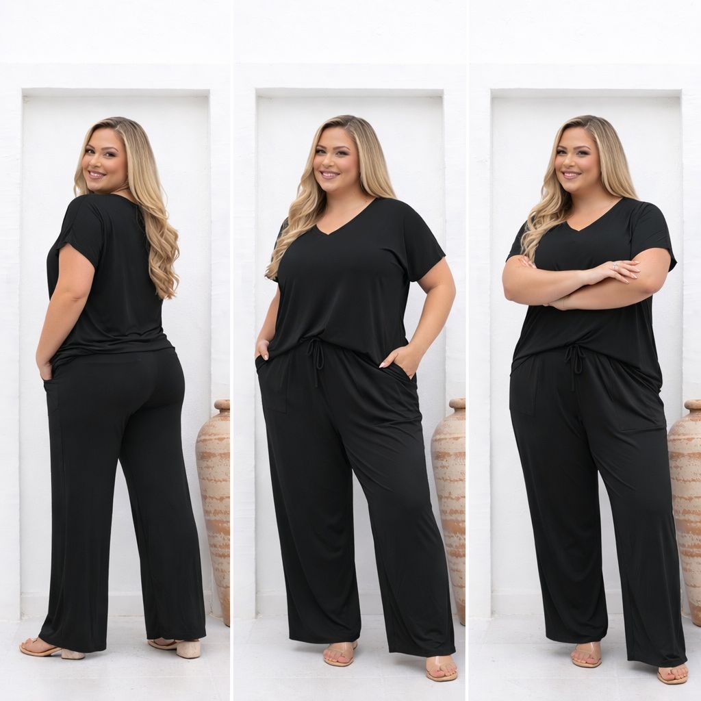 | Conjunto Feminino Plus Size Em Malha Blusa Decote V Calça Pantalona este produto | R$ 65,90 | 67% | 4.9/5 | 62 |