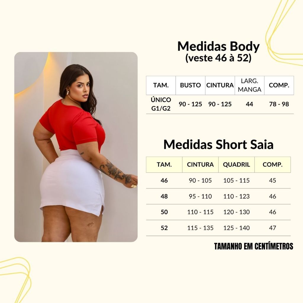 CONJUNTO BODY SUPLEX MANGA PRINCESA E SHORT SAIA BENGALINE MINI FENDA LATERAL Nosso conjunto exclusivo inclui 2 peças essenciais: 1 - Body Suplex (Tamanho Único: veste do 46 ao 52) 2 - Short Saia (Disponível nos tamanhos 46 ao 52) DETALHES DO BODY MANGA CURTA DECOTADO - Modelo decote em "V" e manga princesa, trazendo elegância e sofisticação. - Tecido Suplex Premium encorpado de Alta qualidade com elasticidade, oferece conforto e um caimento impecável, não ficando transparente. - Fecho com dupla regulagem para ajustar o comprimento a sua altura. - Composição: 86% Poliamida, 14% *DETALHES DO SHORT SAIA:* - Feito em tecido bengaline, que é encorpado, não fica transparente e com elasticidade para garantir liberdade de movimentos. - Design moderno: saia na frente e atrás (com short protetor por baixo) detalhe com cinto de fivela decorativo fixo na peça, valorizando suas curvas com estilo. - A modelo veste tamanho 48/50 e está usando o tamanho 48. MEDIDAS BODY Busto: 90cm - 123CM Cintura: 80CM - 100CM Manga: 22cm Comp: 80cm - 100CM MEDIDAS SHORT SAIA 46 - Busto: 90-105 / Quadril: 105-115 / Comprimento 45 48 - Busto: 95-110 / Quadril: 110-123 / Comprimento 46 50 - Busto: 110-115 / Quadril: 120-130 / Comprimento 46 52 - Busto: 115-135 / Quadril: 125-140 / Comprimento 47 *Garanta já o seu kit e arrase com muito conforto e estilo!