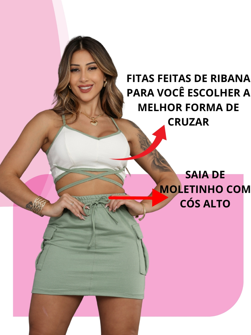 Conjunto Feminino Saia Cargo Moletinho +Blusinha de Ribana Duplo Tecido com Tiras/Moda Gringa Verão