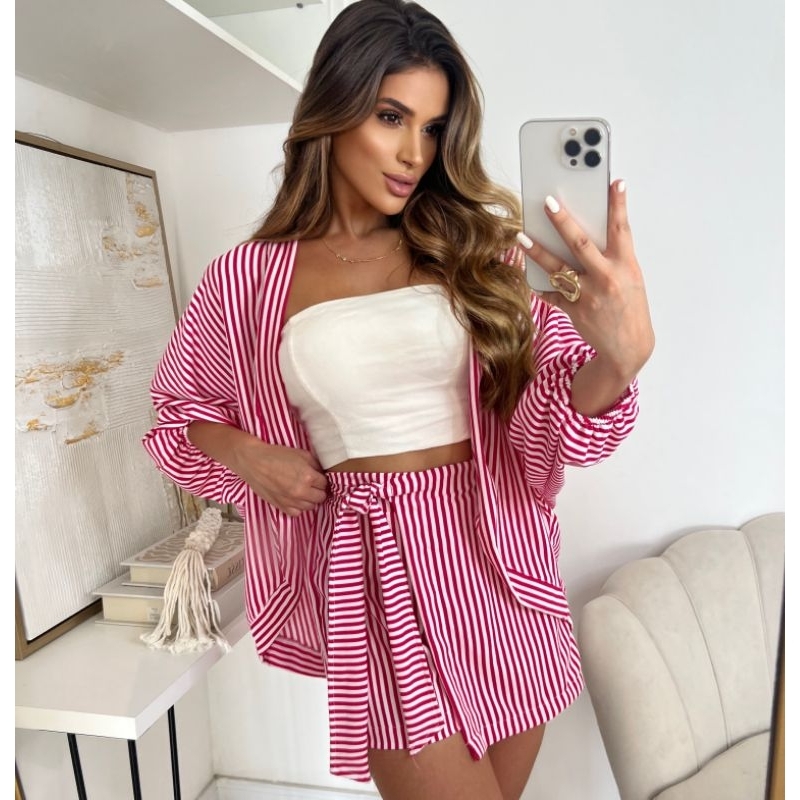 Conjunto Feminino Short y Blusa Kimono Listrado