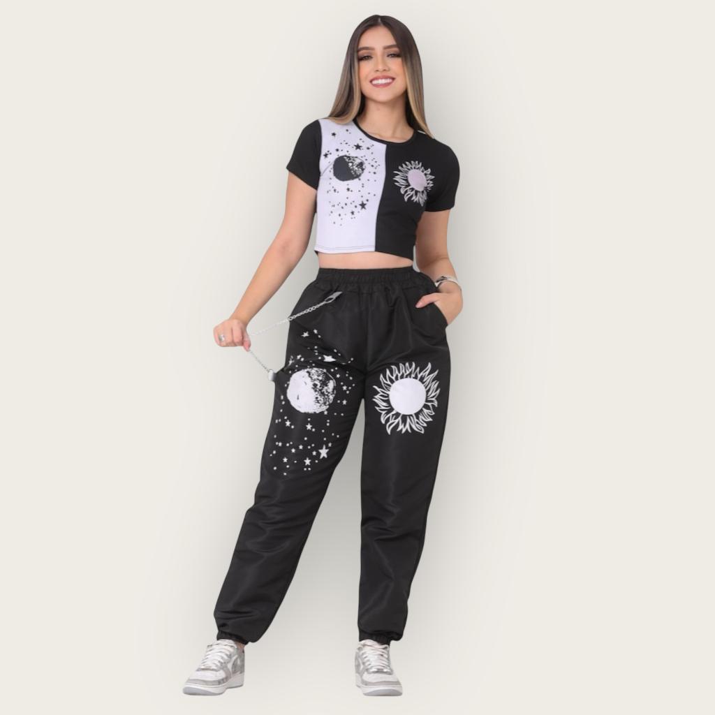 Conjunto Feminino Sol e Lua Estilo Street Calça Tactel Cropped