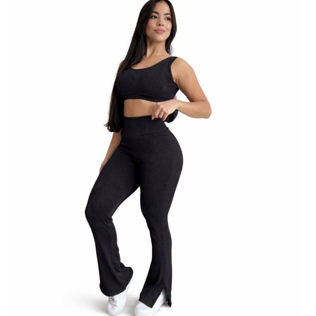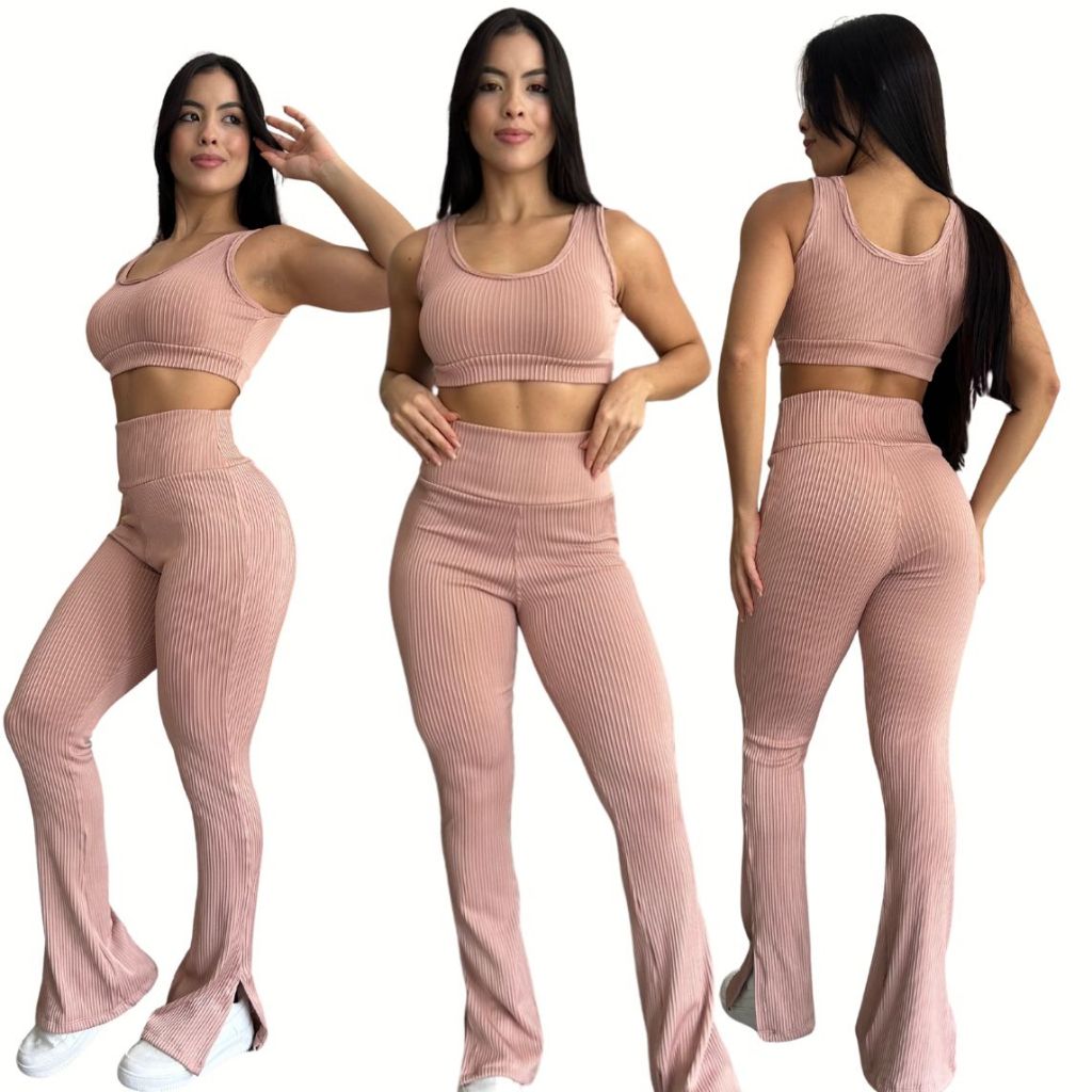 Conjunto composto por: ° Top + calça flare ° Tecido canelado 3D ° 0 transparência ° Alta elasticidade ° Modelagem que valoriza o corpo ° Tecido macio, confortável e com ótimo caimento INDICADO PARA: Moda casual, treinos leves, looks urbanos, viagens, composições para o dia a dia.