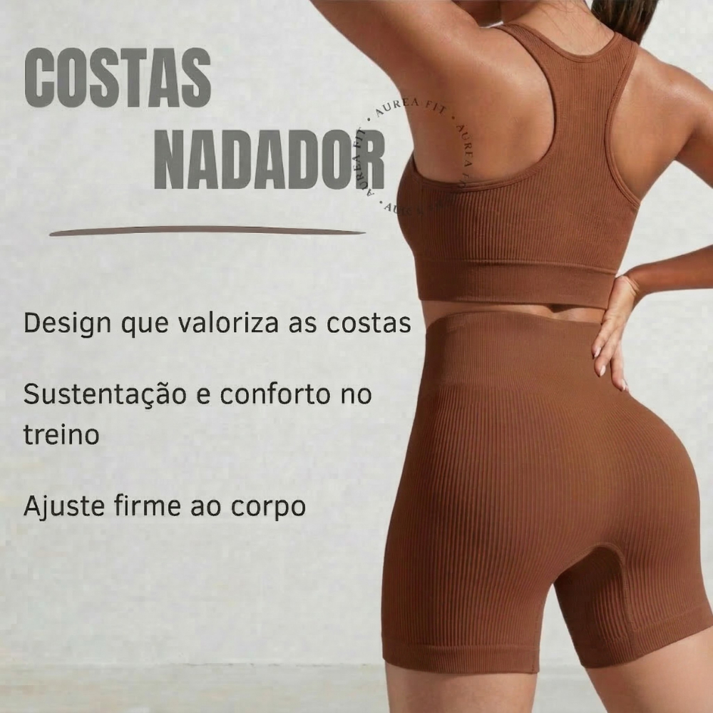 Conjunto Fitness Feminino Short Canelado Sem Costura com Top Bojo Removível Costas Nadador Academia Treino Yoga