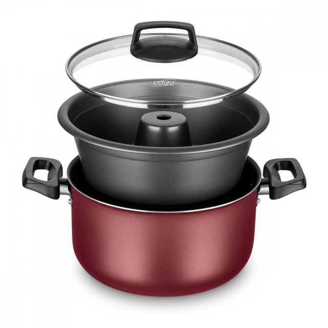 Conjunto Forma de Pudim Banho Maria MTA Cristal 20cm Cereja - 8923 O Conjunto Forma de Pudim Banho Maria MTA Cereja 8923 é a opção perfeita para quem busca praticidade e elegância na hora de preparar sobremesas. Ideal para o preparo de pudins, quindins e outras sobremesas que exigem cozimento no banho-maria, esta forma oferece excelente desempenho e garante resultados incríveis. Material de Alta Qualidade: Fabricada em aço com revestimento, a forma é resistente e durável, proporcionando maior vida útil ao produto. Acabamento Sofisticado: O design moderno e elegante na cor cereja traz um toque de sofisticação à sua cozinha, combinando beleza e funcionalidade. Tampa Ajustável: A tampa de ajuste perfeito ajuda a manter o calor de maneira uniforme durante o processo de cozimento, garantindo pudins e sobremesas bem cozidos e no ponto certo. Capacidade Ideal: O tamanho da forma é perfeito para preparar pudins e outras sobremesas em porções generosas, sendo ideal para festas, reuniões e jantares em família. Versatilidade no Uso: Pode ser utilizada tanto no fogão quanto no forno, proporcionando mais opções de preparo e facilitando a escolha de acordo com a sua receita. Com o Conjunto Forma de Pudim Banho Maria MTA Cereja 8923, você garante a prática na cozinha sem abrir mão da qualidade. Prepare pudins e outras sobremesas com facilidade, com a garantia de um cozimento perfeito e resultados saborosos a cada receita. ESPECIFICAÇÕES Marca: MTA Modelo: 8923 Linha: Cristal Cor: Cereja Largura: 20cm Peso: 0.980 Diâmetro: 20CM Altura: 14cm Capacidade em volume: 3,2 Com revestimento antiaderente: Sim Imagens de caráter ilustrativo. Informações divulgadas de acordo com o manual do fabricante. Produto novo na caixa, lacrado com garantia do fabricante de 3 meses. Em caso de dúvidas sobre informações técnicas, utilização, limitações e manuseio do produto, verifique o manual do fabricante. NAC013589 EAN7897186689234
