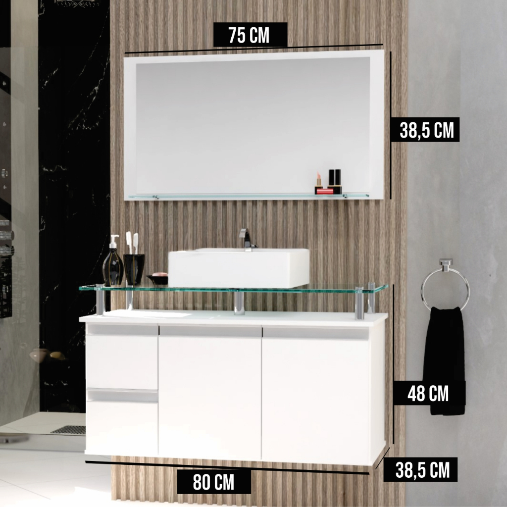 Conjunto Gabinete Banheiro Diamante 80cm MDF + Espelheira + Cuba + tampo de vidro temperado
