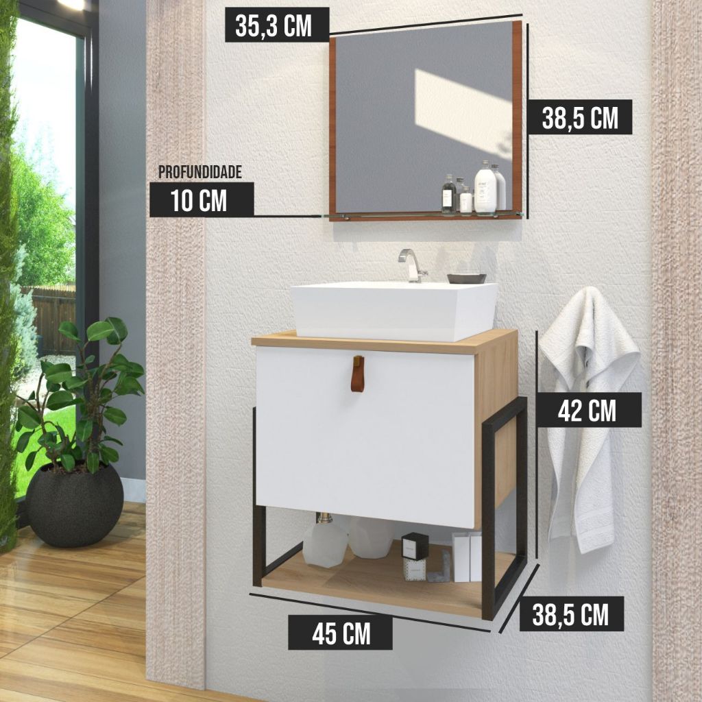 O Gabinete Vegas 45 oferece um design moderno, com seus componentes fabricados em MDF. Este modelo é ideal para quem quer economizar sem deixar de adquirir artigos de luxo. Sua estética moderna e luxuosa oferece qualidade, resistência e praticidade. Inclui: gabinete, pia, ferragens pretas e espelheira. Somos Fabricantes Possuímos variações de cores para o conjunto! PRODUTO TOTALMENTE RESISTENTE A ÚMIDADE E RESPINGOS DE ÁGUA! O MDF é preparado com várias camadas de fundo preparador (prime) seguido de várias camadas de tinta com secagem imediata em câmaras de luzes, garantindo uma grossa camada de material sobre a madeira, tornando-a resistente. Produto: A confecção é 100% em MDF e o recorte é realizados com maquinários de última geração, garantindo um corte milimétrico e preciso para uma estrutura e acabamento de qualidade. Modelo moderno com ferragens pretas laterais, estilo industrial. Modelo bem versátil, pois a porta basculantes do gabinete permitem instalação em encanamentos vindos da parede ou do chão Decoração sofisticada: Em meio aos diversos benefícios de se ter um gabinete em seu banheiro, a principal é ter um ambiente completo, melhor decorado e mais sofisticado, elevando o nível da decoração do seu banheiro. Ferragens anticorrosivo: As ferragens possuem material resistente, que não enferrujam mesmo em contato com água. Ótima durabilidade, tendo eficiência ao abrir e fechar por um longo tempo. Mais organização: Seus itens de uso diários organizados e melhor acondicionados em espaços próprios para serem guardados GABINETE Comprimento: 45cm Altura: 42cm total, apenas gabinete tem 21cm Profundidade: 38,5cm Descrição: Medidas ESPELHEIRA : comp. 35.3cm, alt. 38,5cm e prof. 10cm TAMANHO DA CUBA: : comprimento: 35cm Profundidade: 35CM altura: 11cm Material da PIA: MÁRMORE SINTÉTICO Tipo de Dobradiça: Metálica. Material do Puxador da Porta: couro sintético Possui Portas: 01. Tipo de Porta: Balcão, abre para baixo É enviado montado: Sim. FURO para Torneira: SIM FURO para a Cuba: SIM Válvula da cuba: NÃO ESTÁ INCLUSO! Diâmetro Válvula Cuba: 3,2cm Espelheira: INCLUSA Espelho: INCLUSO Montagem: PRODUTO JÁ MONTADO! Manual montagem: NÃO INCLUI – JÁ VAI MONTADO! Instalação: NÃO INCLUI PARAFUSOS E BUCHAS PRODUTO VAI MONTADO!! (Não requer montagem, apenas instalação no local desejado) INSTALAÇÃO: Recomendamos parafusos e buchas número 08. A fixação do produto é muito simples. NÃO enviamos os parafusos e buchas para instalação. INSTRUÇÕES LIMPEZA: A limpeza deve ser feita com pano úmido e liso. Não utilizar materiais ásperos ou jatos de água diretamente sob o produto. MADEIRA DE REFLORESTAMENTO! CERTIFICAÇÃO DE RECURSOS NATURAIS. DESTAQUE: Resistente a umidade e impacto. Decoração sofisticada. NÃO INCLUI ACESSÓRIOS COMO CIFÃO, VÁLVULAS, PARAFUSOS E BUCHAS PARA INSTALAÇÃO. NÃO INCLUI A TORNEIRA! ATENÇÃO: Produto acompanha cuba e espelheira (com espelho) ENVIAMOS O PRODUTO NO DIA SEGUINTE APÓS A COMPRA FIXAÇÃO DO PRODUTO MUITO SIMPLES! COM APENAS 2 PARAFUSOS E BUCHAS JÁ É POSSÍVEL FIXA-LO NA PAREDE. Qualquer dúvida basta nos chamar que algum de nossos atendentes estará à disposição. Não perca a oportunidade e compre direto do fabricante!