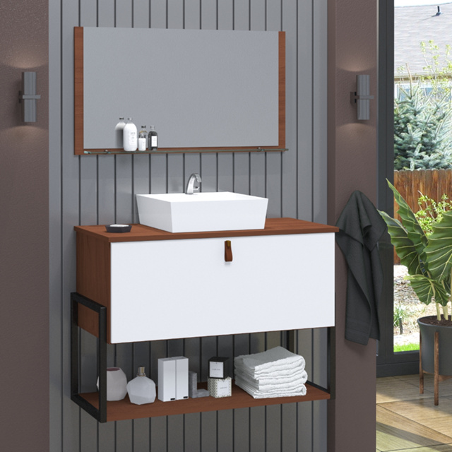 O Gabinete Vegas 80 oferece um design moderno, com seus componentes fabricados em MDF. Este modelo é ideal para quem quer economizar sem deixar de adquirir artigos de luxo. Sua estética moderna e luxuosa oferece qualidade, resistência e praticidade. Inclui: gabinete, pia, ferragens pretas e espelheira. Somos Fabricantes Possuímos variações de cores para o conjunto! PRODUTO TOTALMENTE RESISTENTE A ÚMIDADE E RESPINGOS DE ÁGUA! O MDF é preparado com várias camadas de fundo preparador (prime) seguido de várias camadas de tinta com secagem imediata em câmaras de luzes, garantindo uma grossa camada de material sobre a madeira, tornando-a resistente. Produto: A confecção é 100% em MDF e o recorte é realizados com maquinários de última geração, garantindo um corte milimétrico e preciso para uma estrutura e acabamento de qualidade. Modelo moderno com ferragens pretas laterais, estilo industrial. Modelo bem versátil, pois a porta basculantes do gabinete permitem instalação em encanamentos vindos da parede ou do chão Decoração sofisticada: Em meio aos diversos benefícios de se ter um gabinete em seu banheiro, a principal é ter um ambiente completo, melhor decorado e mais sofisticado, elevando o nível da decoração do seu banheiro. Ferragens anticorrosivo: As ferragens possuem material resistente, que não enferrujam mesmo em contato com água. Ótima durabilidade, tendo eficiência ao abrir e fechar por um longo tempo. Mais organização: Seus itens de uso diários organizados e melhor acondicionados em espaços próprios para serem guardados GABINETE Comprimento: 80cm Altura: 42cm total, apenas gabinete tem 21cm Profundidade: 38,5cm Descrição: Medidas ESPELHEIRA : comp. 75cm, alt. 38,5cm e prof. 10cm TAMANHO DA CUBA: : comprimento: 35cm Profundidade: 35CM altura: 11cm Material da PIA: MÁRMORE SINTÉTICO Tipo de Dobradiça: Metálica. Material do Puxador da Porta: couro sintético Possui Portas: 01. Tipo de Porta: Balcão, abre para baixo É enviado montado: Sim. FURO para Torneira: SIM FURO para a Cuba: SIM Válvula da cuba: NÃO ESTÁ INCLUSO! Diâmetro Válvula Cuba: 3,2cm Espelheira: INCLUSA Espelho: INCLUSO Fechamento da porta: COMUM Montagem: PRODUTO JÁ MONTADO! Manual montagem: NÃO INCLUI – JÁ VAI MONTADO! Instalação: NÃO INCLUI PARAFUSOS E BUCHAS PRODUTO VAI MONTADO!! (Não requer montagem, apenas instalação no local desejado) INSTALAÇÃO: Recomendamos parafusos e buchas número 08. A fixação do produto é muito simples. NÃO enviamos os parafusos e buchas para instalação. INSTRUÇÕES LIMPEZA: A limpeza deve ser feita com pano úmido e liso. Não utilizar materiais ásperos ou jatos de água diretamente sob o produto. MADEIRA DE REFLORESTAMENTO! CERTIFICAÇÃO DE RECURSOS NATURAIS. DESTAQUE: Resistente a umidade e impacto. Decoração sofisticada.