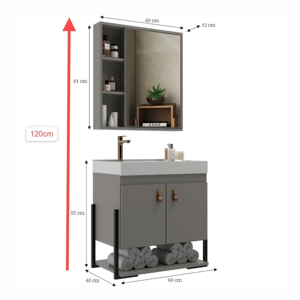 Conjunto Gabinete para Banheiro com Espelheira Maré 60 Cimento
