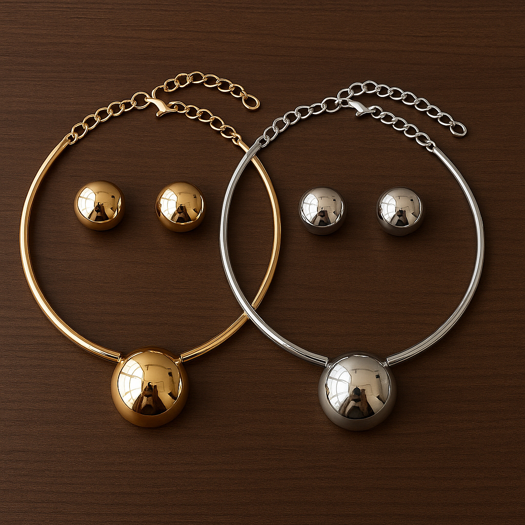 Conjunto super elegante de gargantilha curta com pingente em forma de bola lisa e brincos de esfera combinando. O colar fica na altura da clavícula, realçando o pescoço e deixando qualquer look mais sofisticado. Tamanho da gargantilha: 38 cm + 5 cm de extensor (ajustável, colar curto tipo choker) Inclui 1 gargantilha + 1 par de brincos, conjunto completo Banhado em dourado ou prateado, com brilho espelhado moderno Design minimalista de esfera lisa, combina com looks básicos e de festa Semijoia de ótima qualidade, confortável para uso no dia a dia Perfeito para usar com blusas ombro a ombro, decote canoa ou vestidos mais fechados, dando aquele toque de luxo na região da clavícula. Ótima opção para presentear ou completar seu look nas fotos do Shopee, festas e eventos especiais