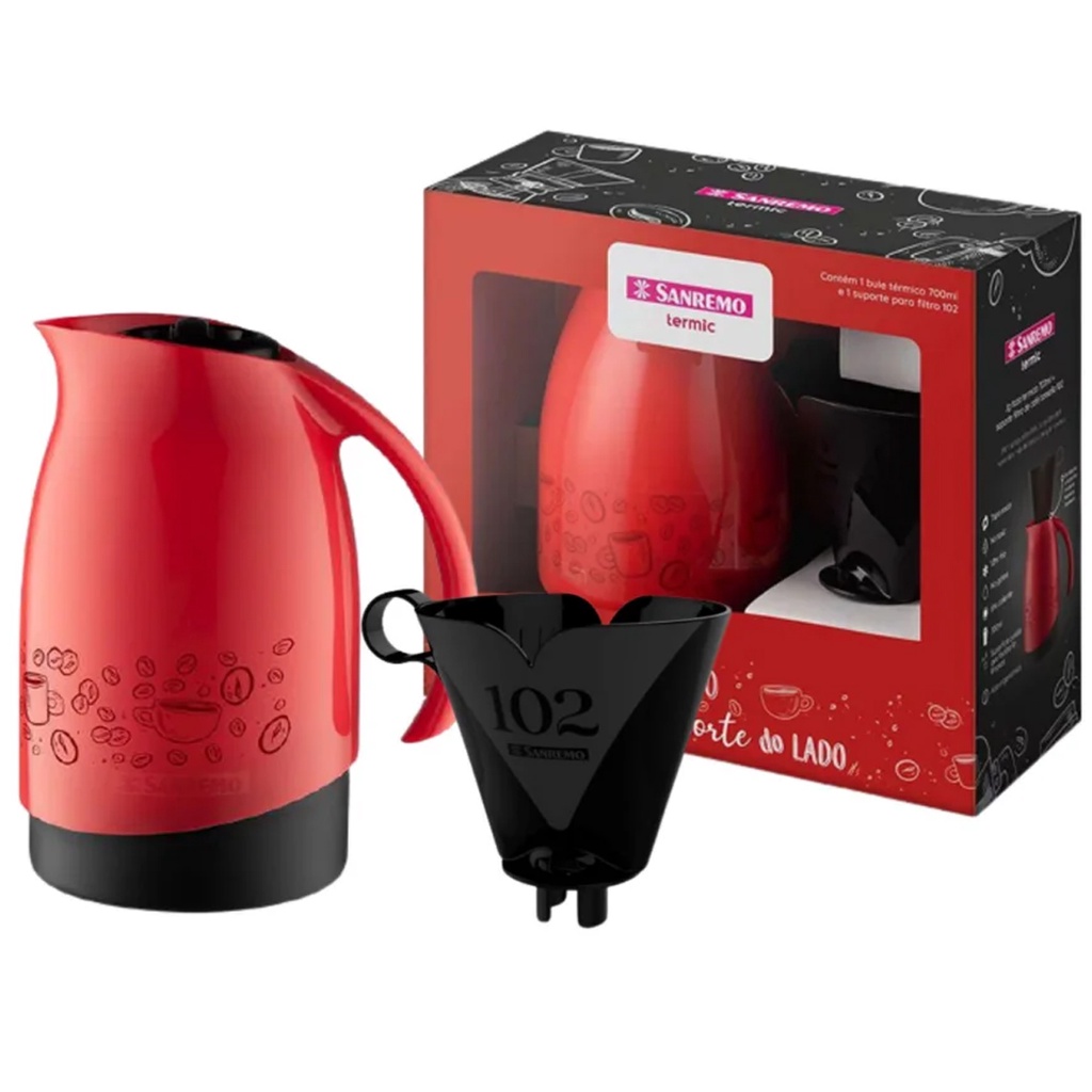 BEM VINDO A ESTRELA DO LAR Conjunto Garrafa Térmica 700ml Mais Filtro Tamanho 102 A garrafa térmica possui um design elegante e funcional, o conjunto possui um bule térmico mais um suporte para filtro. O conjunto é feito em plástico de alta qualidade, o interior do bule possui uma ampola em nitrato de prata, proporcionando uma excelente conservação térmica de 6 horas quente e 12 horas gelado Características: Marca: Sanremo Material: Plástico e nitrato de prata Suporte para Filtro - 13 x 11,5 x 13,5 cm Bule térmico: 19 x 15 x 12 cm Capacidade do bule térmico: 700 ml Agradecemos a preferência. Atenciosamente equipe Estrela do Lar.