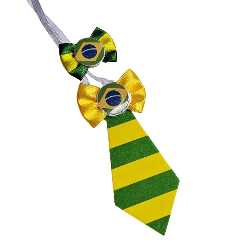Conjunto Pet Brasil Copa do mundo com gravata EVA e laço de cetim. Gravata tamanho único, medindo 12 cm de altura e 65 cm de amarração. Laço de cetim medindo tamanho M medindo 4 cm