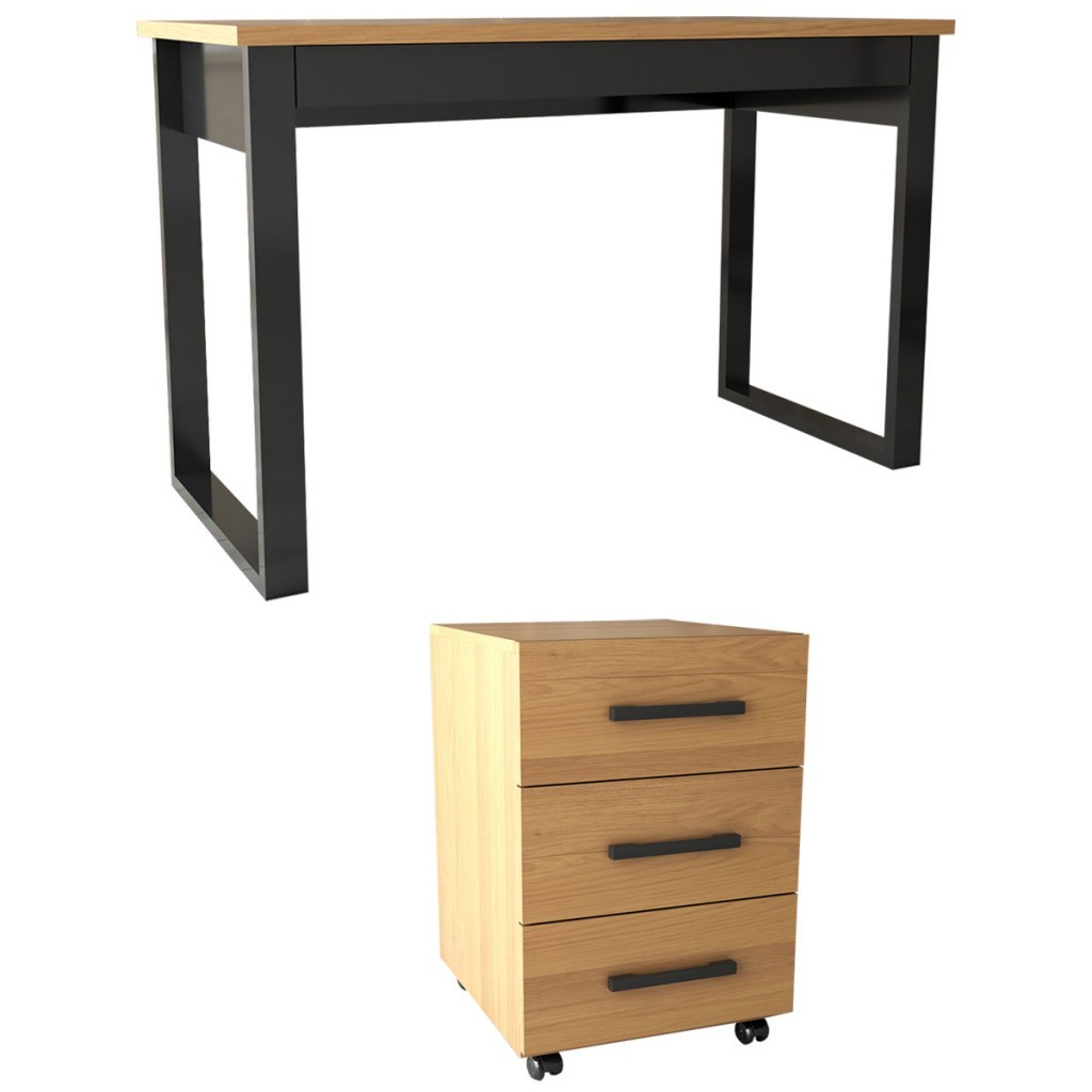Conjunto Home Office Industrial 100% Mdf Mesa e Gaveteiro Freijó/Preto - Panorama Móveis