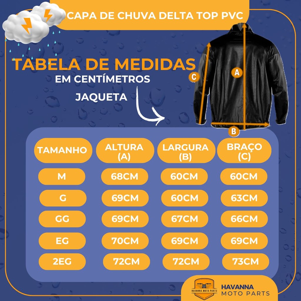 Conjunto de Capa de Chuva Delta Top Pvc Confeccionado em PVC, atende a todas as necessidades do motociclista. Fácil de usar, confortável e prático de guardar. Há mais de 20 anos a Delta Capas investe em materiais de qualidade, atualiza frequentemente os processos de confecção e coloca sua marca nas ruas como uma das principais. Feita Para Você Motoqueiro(a) / Motoboy / Motociclista que enfrenta dias de chuva. Conteúdo da Embalagem: 01 Jaqueta 01 Calça Características: - Marca: Delta - Impermeável - Ajustadores na manga com refletivo - Ajustados em zíper para fechamento da calça com refletivo - Refletivo frente e costas - Masculino - Prático, seguro e 100% à prova d água A Capa de Chuva fabricada em PVC, ideal para dias de chuvas pesadas pois isola completamente a região do pescoço sob o capacete para motociclistas e ótima opção para ciclistas que fazem trilhas ou expedições por estradas e mata. Pensada e desenvolvida para ser confortável, resistente e ao mesmo tempo trazer a proteção ao motociclista a Capa de Chuva Delta é a sua melhor opção no mercado. Guia de Tamanhos: TAMANHO P > IDEAL:ALTURA 1,45 ~ 1,55 METROSE PESO ATÉ 60KG TAMANHO M > IDEAL:ALTURA 1,56 ~ 1,70 METROS E PESO ATÉ 70KG TAMANHO G > IDEAL:ALTURA 1,71 ~ 1,80 METROS E PESO ATÉ 80KG TAMANHO GG > IDEAL:ALTURA 1,81 ~ 1,90 METROS E PESO ATÉ 100KG TAMANHO EG= EGG > IDEAL:ALTURA 1,91 ~ 2,0 METROS E PESO ATÉ 120KG TAMANHO E2G= EXXGG> IDEAL:ALTURA 1,91 ~ METROS E PESO ATÉ 140KG Importante !! - Antes de comprar, verifique o tamanho correto disponível na tabela de medidas e em caso de dúvidas, entre em contato através dos nossos canais de atendimentos.
