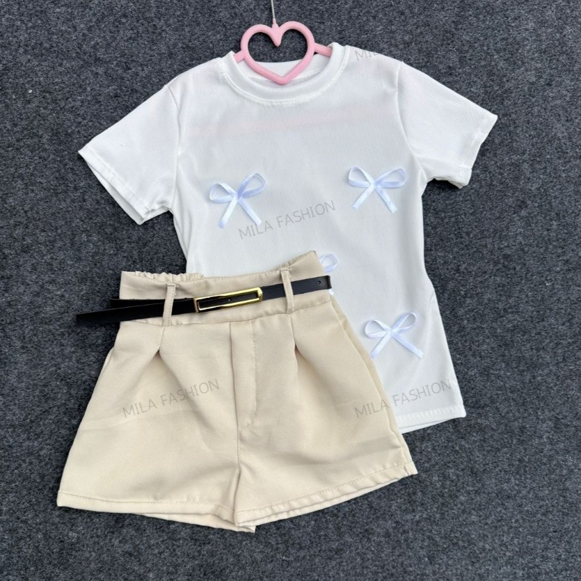 Conjunto infantil 3 peças Blusa lacinhos + Short e cinto de menina moda primavera verão