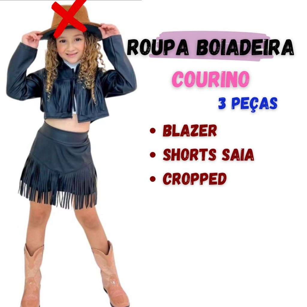 ✨ LOOK BOIADEIRA EM CORINO — ESTILO, QUALIDADE E PREÇO ESPECIAL! ✨ Deixe sua pequena ainda mais poderosa com esse conjunto boiadeira feito em corino de inverno, perfeito para compor looks estilosos e cheios de atitude! Composto por 3 peças modernas e confortáveis: 👗 Blazer com corte impecável 👚 Cropped em malha canelada 🩳 Shorts saia em corino, para um visual autêntico e atual ✅ Ideal para festas temáticas, rodeios, passeios e ensaios fotográficos ✅ Tecido corino inverno, com acabamento de qualidade, indicado para uso ocasional ✅ Preço especial de lançamento! ✅ Postamos em até 12 horas após a confirmação da compra Garanta já esse conjunto incrível e transforme o look da sua pequena cowgirl com muito charme e personalidade!