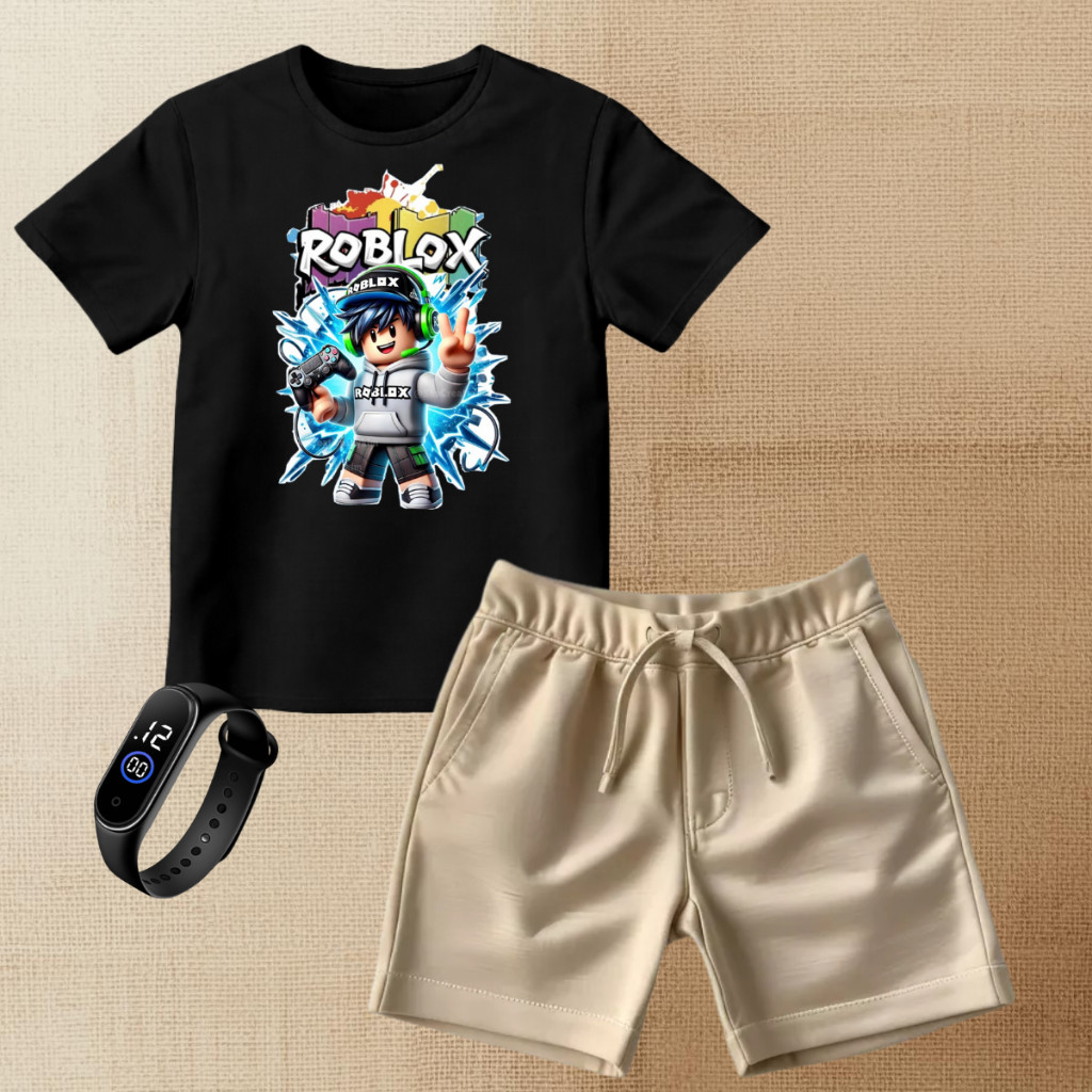 Conjunto Infantil Camiseta Roblox Bermuda Moletinho + Relógio Menino Gamer Estiloso