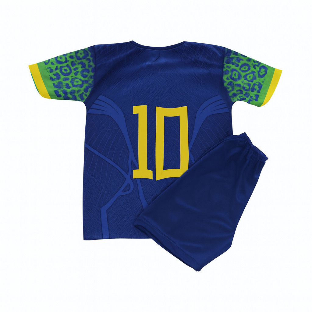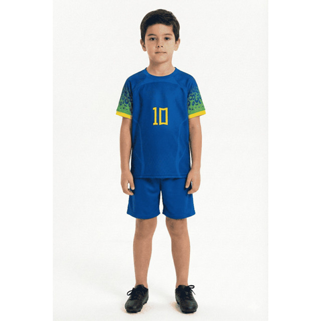Design Único: A camisa, com o número 10 estampado em amarelo, remete ao talento e à garra dos maiores jogadores brasileiros, como Neymar Jr. As mangas com estampa de onça adicionam um toque especial e representam a força da fauna brasileira. Conforto e Qualidade: Fabricado em tecido 100% poliéster, o conjunto é leve, fresco e resistente, ideal para proporcionar liberdade de movimento e conforto durante as brincadeiras, os treinos ou para torcer com a família. Versatilidade: Este conjunto é a escolha perfeita para diversas ocasiões, como jogos no parque, passeios e eventos esportivos. É uma excelente maneira de incentivar o amor pelo esporte e pela seleção desde cedo. Vista seu campeão com as cores do Brasil e o estilo que ele merece!