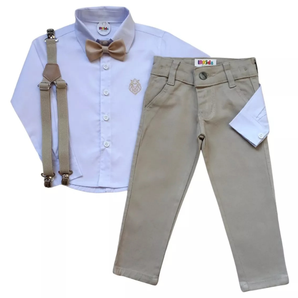 Acompanha suspensório e gravata Camisa Social: •Manga longa •Modelo slim •Cor branca •Pequeno bordado frontal Calça: •Sarja com elastano •Modelo slim •Cor bege •Bolso faca •Regulagem interna •Fechamento por zíper e botão Tabela de Medidas (Frente da Peça) Camisa: Tamanho 1: Comprimento 35 cm / Largura 25 cm / Manga 35 cm Tamanho 2: Comprimento 37 cm / Largura 27 cm / Manga 36 cm Tamanho 3: Comprimento 40 cm / Largura 31 cm / Manga 37 cm Tamanho 4: Comprimento 44 cm / Largura 35 cm / Manga 42 cm Tamanho 6: Comprimento 48 cm / Largura 38 cm / Manga 44 cm Tamanho 8: Comprimento 50 cm / Largura 39 cm / Manga 46 cm Tamanho 10: Comprimento 53 cm / Largura 42 cm / Manga 53 cm Tamanho 12: Comprimento 55 cm / Largura 45 cm / Manga 55 cm Tamanho 14: Comprimento 57 cm / Largura 49 cm / Manga 57 cm Tamanho 16: Comprimento 64 cm / Largura 50 cm / Manga 64 cm Calça: Tamanho 1: Comprimento 46 cm / Cintura 21 cm Tamanho 2: Comprimento 49 cm / Cintura 23 cm Tamanho 3: Comprimento 52 cm / Cintura 25 cm Tamanho 4: Comprimento 69 cm / Cintura 26 cm Tamanho 6: Comprimento 72 cm / Cintura 27 cm Tamanho 8: Comprimento 76 cm / Cintura 29 cm Tamanho 10: Comprimento 84 cm / Cintura 32 cm Tamanho 12: Comprimento 89 cm / Cintura 34 cm Tamanho 14: Comprimento 93 cm / Cintura 36 cm Tamanho 16: Comprimento 100 cm / Cintura 37 cm Ocasiões de Uso: Aniversário - Batizado - Casamento - Evento - Festa - Pajem