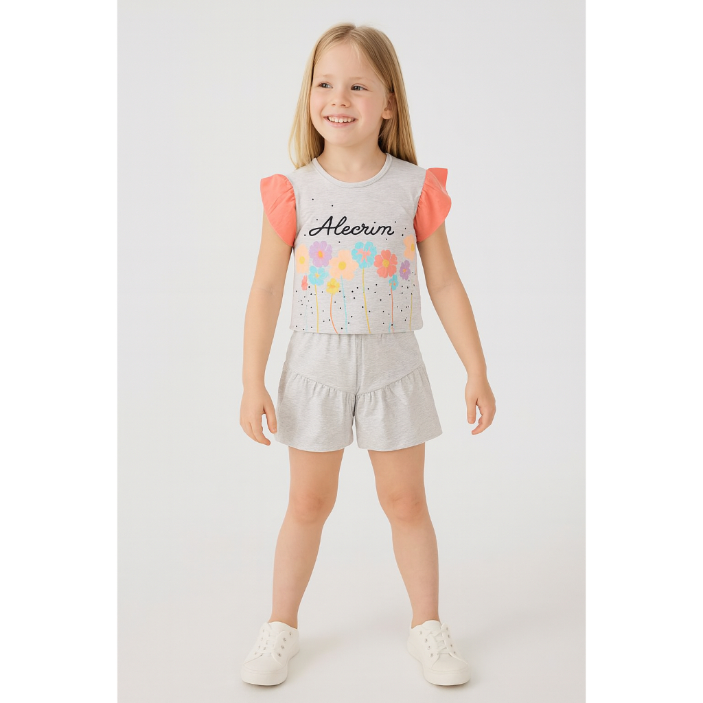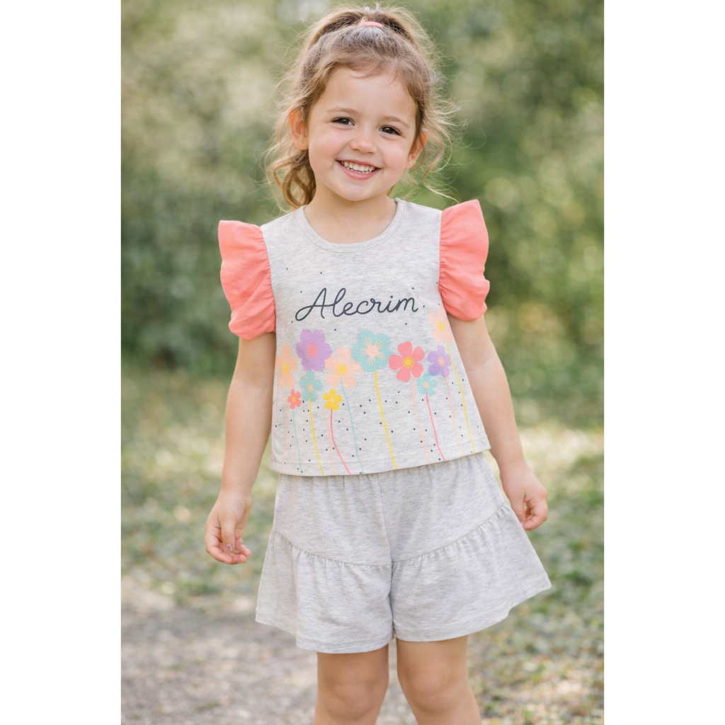 Conjunto Infantil Estampa Alecrim Blusa Manga Franzida e Bermuda com Recorte e Franzido