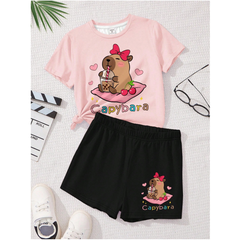 Conjunto Infantil Feminino Capivara MilkShake 673 Look Estiloso Verão Passeio Aniversário Presente