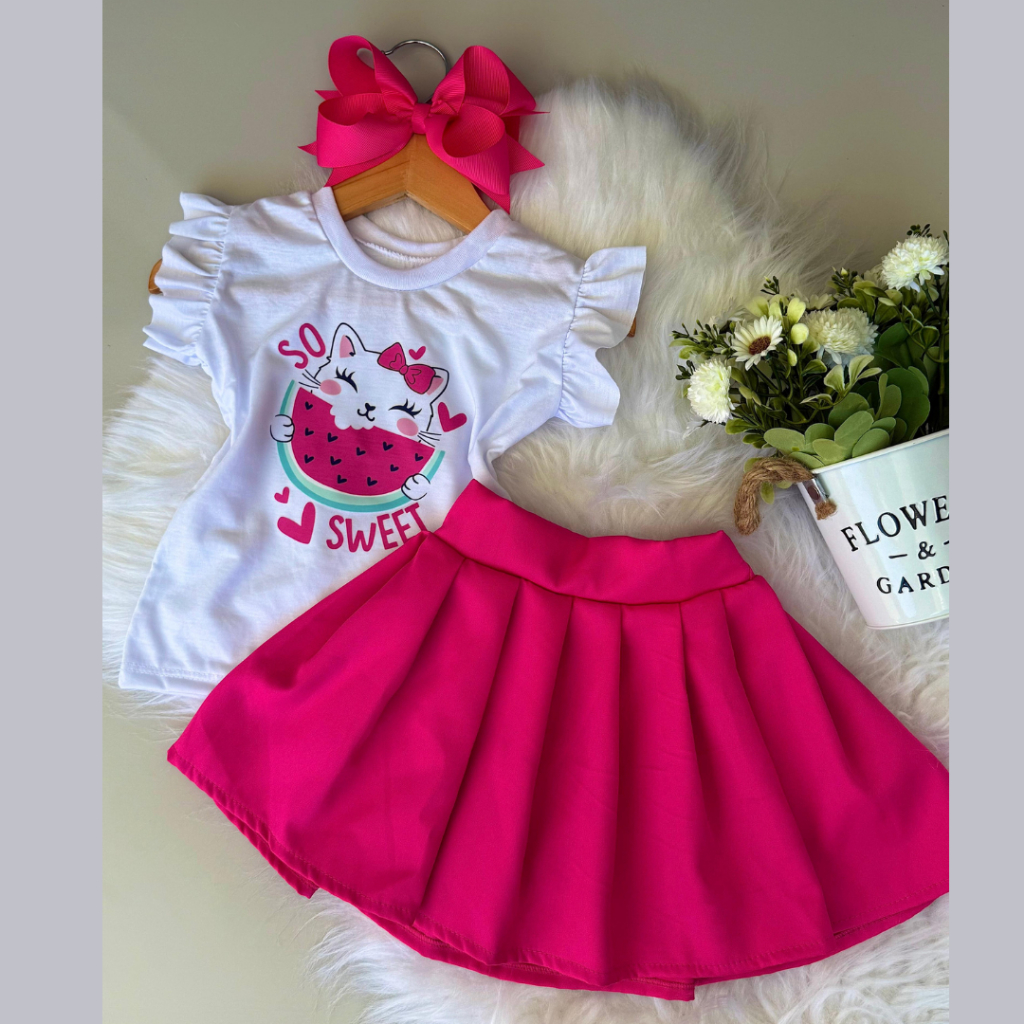 Conjunto infantil feminino de saia plissada e manga de babado gatinha so sweet