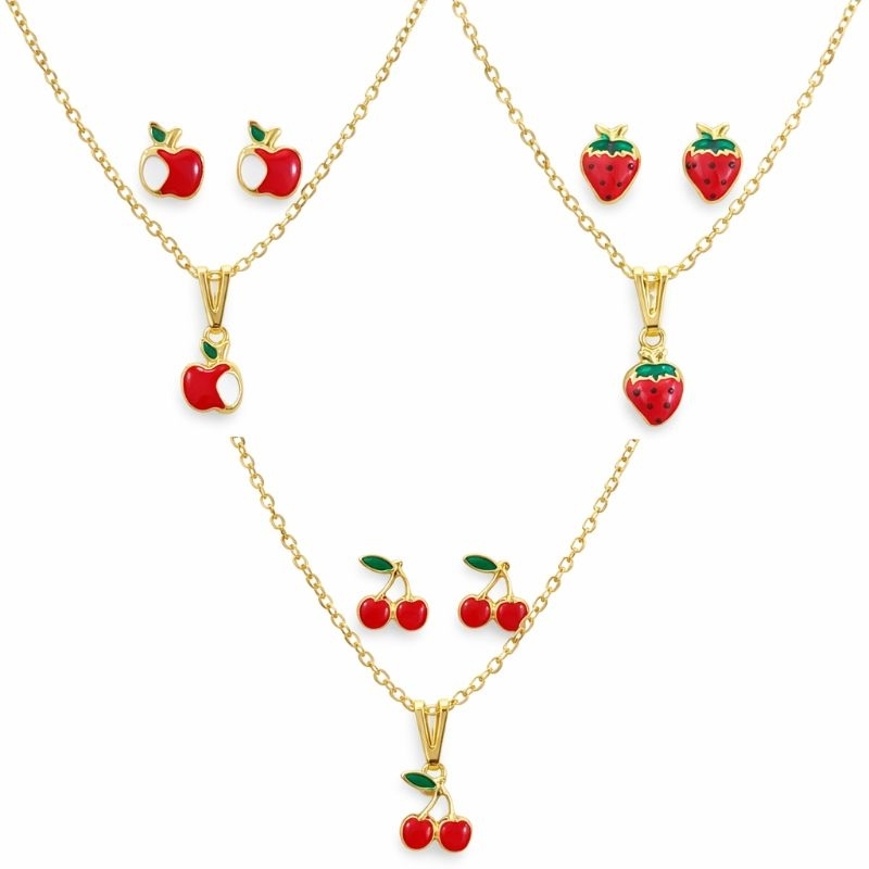 Conjunto Infantil Folheado Colar e Brinco Frutas Cereja, Maçã e Morango – Lindo Presente