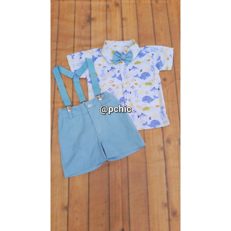 Conjunto Infantil Fundo do Mar Modelo Curto Longo Aniversario Tricoline 4 Peças Camisa Bermuda Suspensório e Gravata
