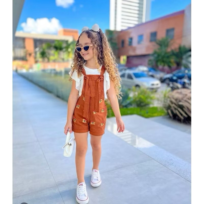 Conjunto Infantil Jardineira Macaquinho Jeans Bordado Ursinha C/Blusa Menina Blogueirinha Fashion