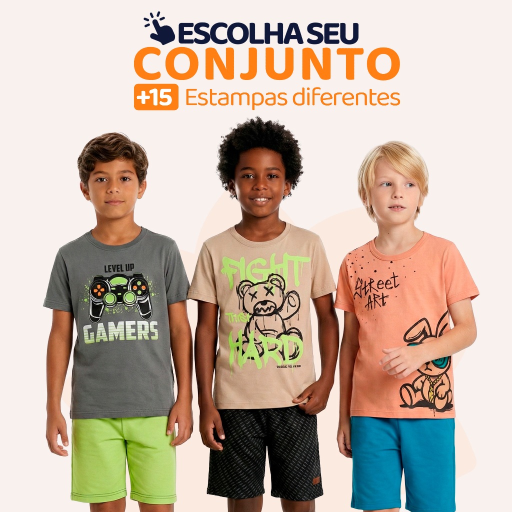 Conjunto Infantil Masculino – Camiseta ou Regata + Bermuda Estilo, conforto e liberdade para o dia a dia Conjunto infantil composto por: -1 camiseta ou regata (escolha o modelo) -1 bermuda moletinho As peças são ideais para o uso diário, seja na escola, passeios ou momentos de lazer. A malha leve e a bermuda com elástico confortável garantem liberdade para brincar com muito conforto. Detalhes do Produto -Camisetas e regatas em meia malha 100% algodão -Gola redonda com reforço de ombro -Bermudas em moletinho com no mínimo 85% algodão -Elástico na cintura com ajuste confortável -Modelos variados – escolha o conjunto desejado Tabela de Medidas – Camiseta/Regata Tam 1 – Busto 27 cm | Comprimento 36 cm | Tam 2 – Busto 28 cm | Comprimento 38 cm | Tam 3 – Busto 29 cm | Comprimento 40 cm | Tam 4 – Busto 31 cm | Comprimento 46 cm | Tam 6 – Busto 33 cm | Comprimento 48 cm | Tam 8 – Busto 34 cm | Comprimento 49 cm | Tam 10 – Busto 36 cm | Comprimento 53 cm | Bermuda Moletinho Tam 1 – Cintura 20 cm | Comprimento 26 cm Tam 2 – Cintura 21 cm | Comprimento 27 cm Tam 3 – Cintura 21 cm | Comprimento 28 cm Tam 4 – Cintura 22 cm | Comprimento 32 cm Tam 6 – Cintura 23 cm | Comprimento 35 cm Tam 8 – Cintura 24 cm | Comprimento 36 cm Tam 10 – Cintura 25 cm | Comprimento 38 cm Pode haver pequena variação nas medidas devido ao processo de confecção. Vantagens do Produto Peças leves, frescas e respiráveis Conforto ideal para o verão e dias quentes Modelos fáceis de vestir e combinar Ótima durabilidade e acabamento Dica: Adicione mais de um modelo ao carrinho e aproveite o mesmo frete para montar o kit ideal para o seu filho. Perguntas Frequentes 1. Posso escolher o conjunto? Sim. Basta selecionar a estampa e o tamanho desejado no momento da compra. 2. As peças são fresquinhas? Sim. A camiseta ou regata é feita em malha 100% algodão, ideal para dias quentes. 3. A bermuda tem elástico? Sim. Todas as bermudas têm elástico confortável e macio na cintura.
