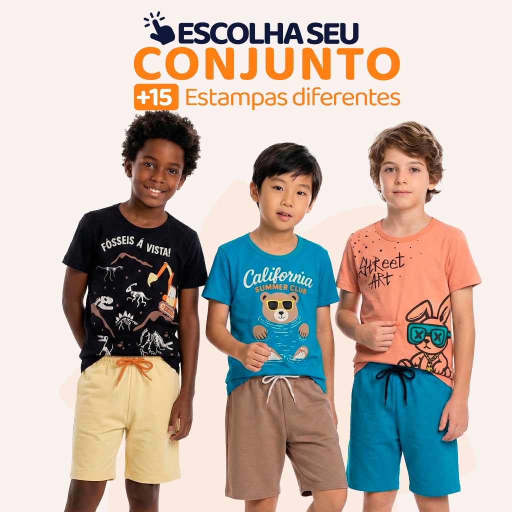 Conjunto Infantil Masculino – Camiseta ou Regata + Bermuda Estilo, conforto e liberdade para o dia a dia Conjunto infantil composto por: -1 camiseta ou regata (escolha o modelo) -1 bermuda moletinho As peças são ideais para o uso diário, seja na escola, passeios ou momentos de lazer. A malha leve e a bermuda com elástico confortável garantem liberdade para brincar com muito conforto. Detalhes do Produto -Camisetas e regatas em meia malha 100% algodão -Gola redonda com reforço de ombro -Bermudas em moletinho com no mínimo 85% algodão -Elástico na cintura com ajuste confortável -Modelos variados – escolha o conjunto desejado Tabela de Medidas – Camiseta/Regata Tam 1 – Busto 27 cm | Comprimento 36 cm | Tam 2 – Busto 28 cm | Comprimento 38 cm | Tam 3 – Busto 29 cm | Comprimento 40 cm | Tam 4 – Busto 31 cm | Comprimento 46 cm | Tam 6 – Busto 33 cm | Comprimento 48 cm | Tam 8 – Busto 34 cm | Comprimento 49 cm | Tam 10 – Busto 36 cm | Comprimento 53 cm | Bermuda Moletinho Tam 1 – Cintura 20 cm | Comprimento 26 cm Tam 2 – Cintura 21 cm | Comprimento 27 cm Tam 3 – Cintura 21 cm | Comprimento 28 cm Tam 4 – Cintura 22 cm | Comprimento 32 cm Tam 6 – Cintura 23 cm | Comprimento 35 cm Tam 8 – Cintura 24 cm | Comprimento 36 cm Tam 10 – Cintura 25 cm | Comprimento 38 cm Pode haver pequena variação nas medidas devido ao processo de confecção. Vantagens do Produto Peças leves, frescas e respiráveis Conforto ideal para o verão e dias quentes Modelos fáceis de vestir e combinar Ótima durabilidade e acabamento Dica: Adicione mais de um modelo ao carrinho e aproveite o mesmo frete para montar o kit ideal para o seu filho. Perguntas Frequentes 1. Posso escolher o conjunto? Sim. Basta selecionar a estampa e o tamanho desejado no momento da compra. 2. As peças são fresquinhas? Sim. A camiseta ou regata é feita em malha 100% algodão, ideal para dias quentes. 3. A bermuda tem elástico? Sim. Todas as bermudas têm elástico confortável e macio na cintura.