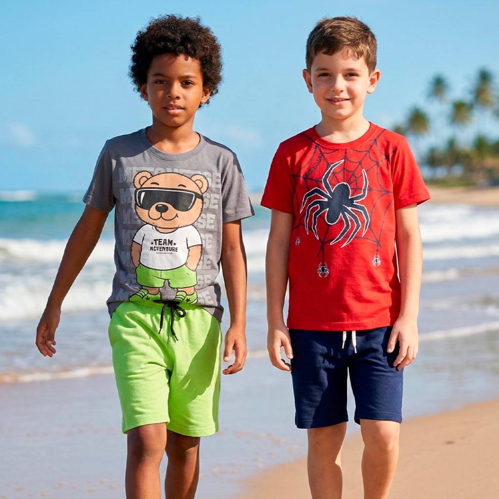 Conjunto Infantil Masculino – Camiseta ou Regata + Bermuda Estilo, conforto e liberdade para o dia a dia Conjunto infantil composto por: -1 camiseta ou regata (escolha o modelo) -1 bermuda moletinho As peças são ideais para o uso diário, seja na escola, passeios ou momentos de lazer. A malha leve e a bermuda com elástico confortável garantem liberdade para brincar com muito conforto. Detalhes do Produto -Camisetas e regatas em meia malha 100% algodão -Gola redonda com reforço de ombro -Bermudas em moletinho com no mínimo 85% algodão -Elástico na cintura com ajuste confortável -Modelos variados – escolha o conjunto desejado Tabela de Medidas – Camiseta/Regata Tam 1 – Busto 27 cm | Comprimento 36 cm | Tam 2 – Busto 28 cm | Comprimento 38 cm | Tam 3 – Busto 29 cm | Comprimento 40 cm | Tam 4 – Busto 31 cm | Comprimento 46 cm | Tam 6 – Busto 33 cm | Comprimento 48 cm | Tam 8 – Busto 34 cm | Comprimento 49 cm | Tam 10 – Busto 36 cm | Comprimento 53 cm | Bermuda Moletinho Tam 1 – Cintura 20 cm | Comprimento 26 cm Tam 2 – Cintura 21 cm | Comprimento 27 cm Tam 3 – Cintura 21 cm | Comprimento 28 cm Tam 4 – Cintura 22 cm | Comprimento 32 cm Tam 6 – Cintura 23 cm | Comprimento 35 cm Tam 8 – Cintura 24 cm | Comprimento 36 cm Tam 10 – Cintura 25 cm | Comprimento 38 cm Pode haver pequena variação nas medidas devido ao processo de confecção. Vantagens do Produto Peças leves, frescas e respiráveis Conforto ideal para o verão e dias quentes Modelos fáceis de vestir e combinar Ótima durabilidade e acabamento Dica: Adicione mais de um modelo ao carrinho e aproveite o mesmo frete para montar o kit ideal para o seu filho. Perguntas Frequentes 1. Posso escolher o conjunto? Sim. Basta selecionar a estampa e o tamanho desejado no momento da compra. 2. As peças são fresquinhas? Sim. A camiseta ou regata é feita em malha 100% algodão, ideal para dias quentes. 3. A bermuda tem elástico? Sim. Todas as bermudas têm elástico confortável e macio na cintura.