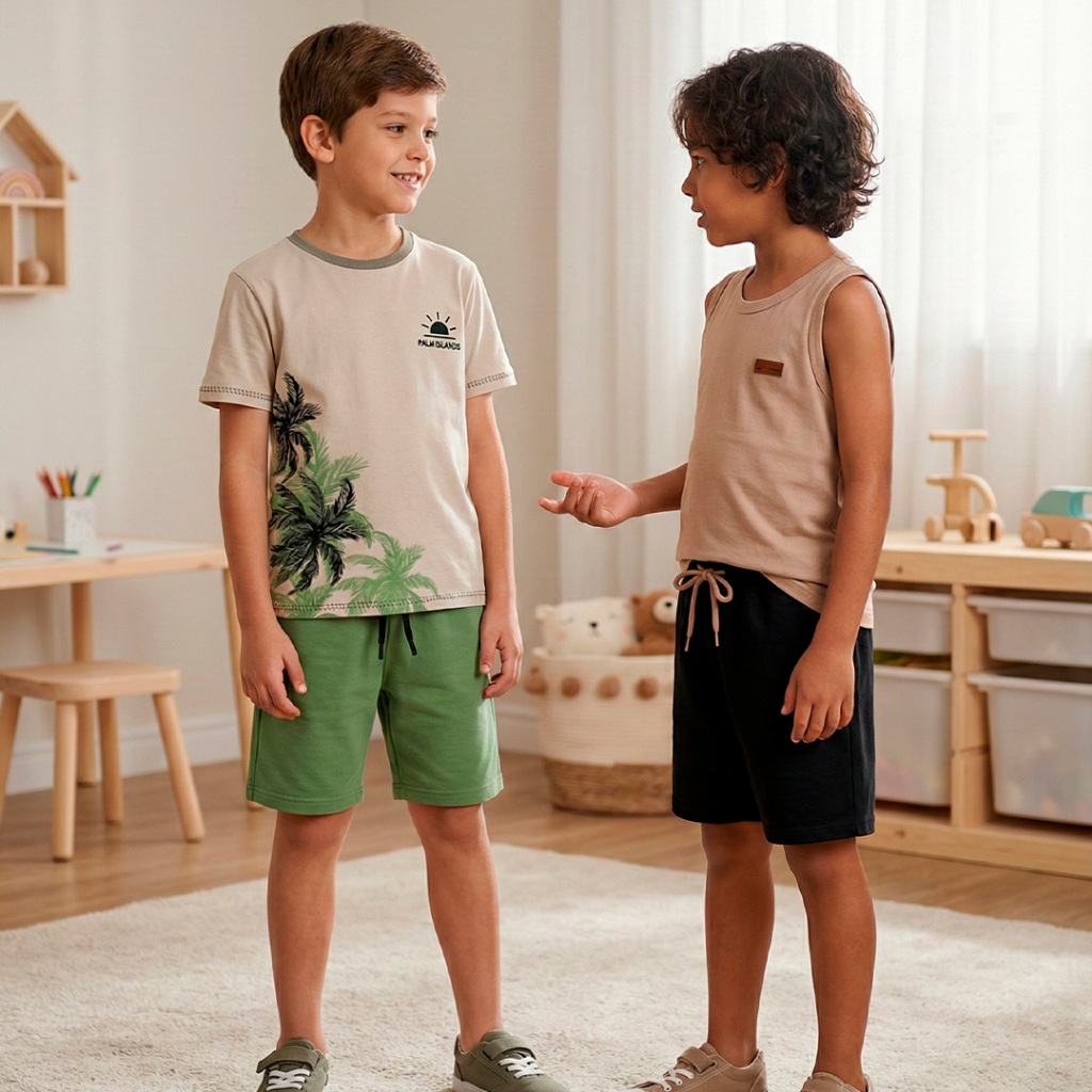 Conjunto Infantil Masculino – Camiseta ou Regata + Bermuda Estilo, conforto e liberdade para o dia a dia Conjunto infantil composto por: -1 camiseta ou regata (escolha o modelo) -1 bermuda moletinho As peças são ideais para o uso diário, seja na escola, passeios ou momentos de lazer. A malha leve e a bermuda com elástico confortável garantem liberdade para brincar com muito conforto. Detalhes do Produto -Camisetas e regatas em meia malha 100% algodão -Gola redonda com reforço de ombro -Bermudas em moletinho com no mínimo 85% algodão -Elástico na cintura com ajuste confortável -Modelos variados – escolha o conjunto desejado Tabela de Medidas – Camiseta/Regata Tam 1 – Busto 27 cm | Comprimento 36 cm | Tam 2 – Busto 28 cm | Comprimento 38 cm | Tam 3 – Busto 29 cm | Comprimento 40 cm | Tam 4 – Busto 31 cm | Comprimento 46 cm | Tam 6 – Busto 33 cm | Comprimento 48 cm | Tam 8 – Busto 34 cm | Comprimento 49 cm | Tam 10 – Busto 36 cm | Comprimento 53 cm | Bermuda Moletinho Tam 1 – Cintura 20 cm | Comprimento 26 cm Tam 2 – Cintura 21 cm | Comprimento 27 cm Tam 3 – Cintura 21 cm | Comprimento 28 cm Tam 4 – Cintura 22 cm | Comprimento 32 cm Tam 6 – Cintura 23 cm | Comprimento 35 cm Tam 8 – Cintura 24 cm | Comprimento 36 cm Tam 10 – Cintura 25 cm | Comprimento 38 cm Pode haver pequena variação nas medidas devido ao processo de confecção. Vantagens do Produto Peças leves, frescas e respiráveis Conforto ideal para o verão e dias quentes Modelos fáceis de vestir e combinar Ótima durabilidade e acabamento Dica: Adicione mais de um modelo ao carrinho e aproveite o mesmo frete para montar o kit ideal para o seu filho. Perguntas Frequentes 1. Posso escolher o conjunto? Sim. Basta selecionar a estampa e o tamanho desejado no momento da compra. 2. As peças são fresquinhas? Sim. A camiseta ou regata é feita em malha 100% algodão, ideal para dias quentes. 3. A bermuda tem elástico? Sim. Todas as bermudas têm elástico confortável e macio na cintura.