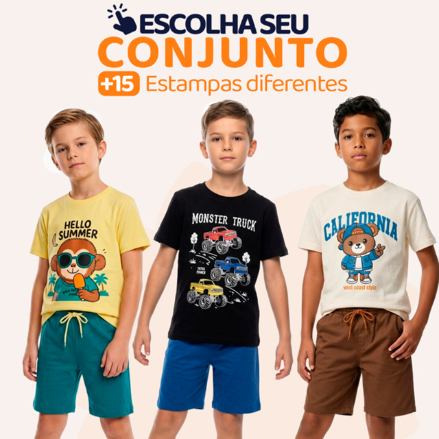 Conjunto Infantil Masculino – Camiseta ou Regata + Bermuda Estilo, conforto e liberdade para o dia a dia Conjunto infantil composto por: -1 camiseta ou regata (escolha o modelo) -1 bermuda moletinho As peças são ideais para o uso diário, seja na escola, passeios ou momentos de lazer. A malha leve e a bermuda com elástico confortável garantem liberdade para brincar com muito conforto. Detalhes do Produto -Camisetas e regatas em meia malha 100% algodão -Gola redonda com reforço de ombro -Bermudas em moletinho com no mínimo 85% algodão -Elástico na cintura com ajuste confortável -Modelos variados – escolha o conjunto desejado Tabela de Medidas – Camiseta/Regata Tam 1 – Busto 27 cm | Comprimento 36 cm | Tam 2 – Busto 28 cm | Comprimento 38 cm | Tam 3 – Busto 29 cm | Comprimento 40 cm | Tam 4 – Busto 31 cm | Comprimento 46 cm | Tam 6 – Busto 33 cm | Comprimento 48 cm | Tam 8 – Busto 34 cm | Comprimento 49 cm | Tam 10 – Busto 36 cm | Comprimento 53 cm | Bermuda Moletinho Tam 1 – Cintura 20 cm | Comprimento 26 cm Tam 2 – Cintura 21 cm | Comprimento 27 cm Tam 3 – Cintura 21 cm | Comprimento 28 cm Tam 4 – Cintura 22 cm | Comprimento 32 cm Tam 6 – Cintura 23 cm | Comprimento 35 cm Tam 8 – Cintura 24 cm | Comprimento 36 cm Tam 10 – Cintura 25 cm | Comprimento 38 cm Pode haver pequena variação nas medidas devido ao processo de confecção. Vantagens do Produto Peças leves, frescas e respiráveis Conforto ideal para o verão e dias quentes Modelos fáceis de vestir e combinar Ótima durabilidade e acabamento Dica: Adicione mais de um modelo ao carrinho e aproveite o mesmo frete para montar o kit ideal para o seu filho. Perguntas Frequentes 1. Posso escolher o conjunto? Sim. Basta selecionar a estampa e o tamanho desejado no momento da compra. 2. As peças são fresquinhas? Sim. A camiseta ou regata é feita em malha 100% algodão, ideal para dias quentes. 3. A bermuda tem elástico? Sim. Todas as bermudas têm elástico confortável e macio na cintura.