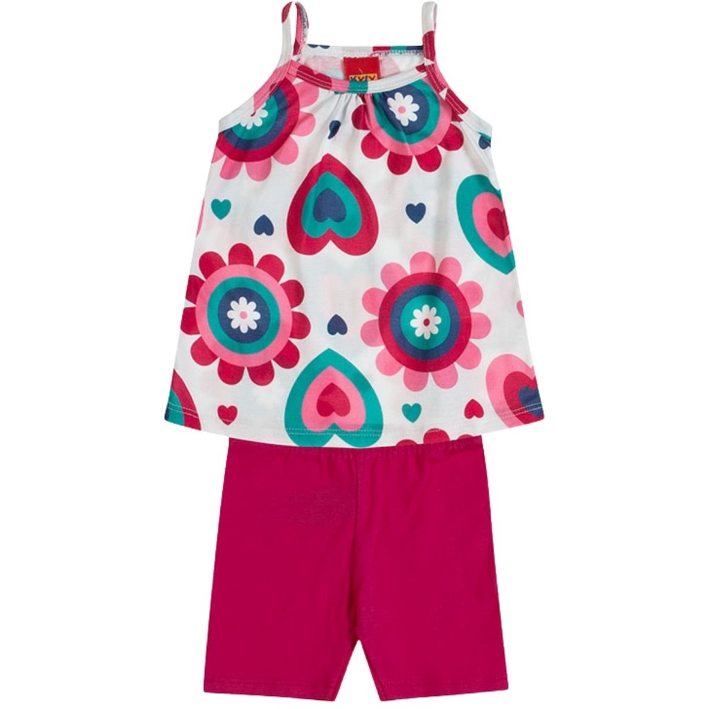 Conjunto Infantil Menina Verão Regata e Ciclista em Cotton Confortável Sofisticado Kyly 1000984 Um conjunto alegre e cheio de charme para iluminar o dia das pequenas! O look infantil magenta com blusinha de alças finas e short azul?? da Kyly é a escolha perfeita para quem busca conforto, cor e estilo. A blusinha em tom magenta vibrante é decorada com uma linda estampa de flores e corações estilizados em cores vivas como rosa, amarelo, azul e branco. Com alcinhas finas e modelagem leve, é perfeita para os dias mais quentes. O short azul marinho complementa o visual com equilíbrio e praticidade, ideal para brincadeiras ou passeios ao ar livre. Indicação de uso: Ideal para momentos de lazer, escolinha, passeios ou aquele dia especial em família. Um look que une estilo e liberdade para a criança brincar à vontade! Destaques do Produto: Blusinha com estampa alegre de flores e corações Fundo magenta vibrante que destaca o visual Alcinhas finas e modelagem soltinha para maior conforto Short básico azul marinho incluso Marca: Kyly Look divertido e prático para o dia a dia Tamanho: 1 a 8 Composição: Blusa: 100% Algodão. Short: 96% Algodão, 4% Elastano