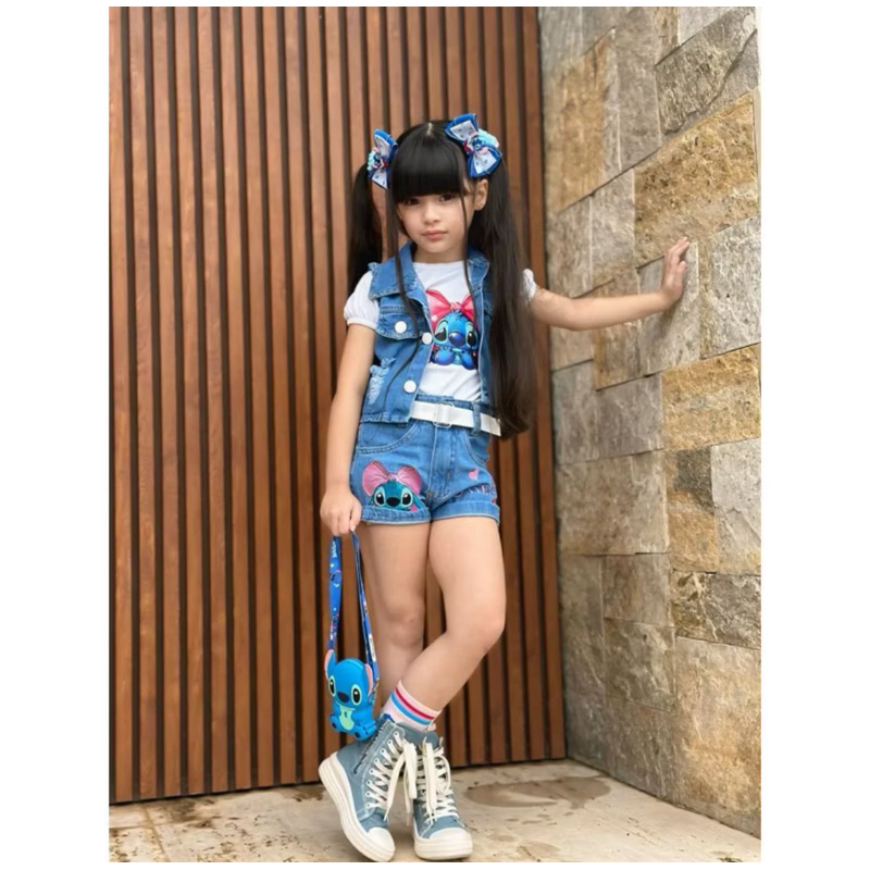 Conjunto Infantil Menina Bloguerinha Colete Jeans + Blusa + Short Jeans * Cinto