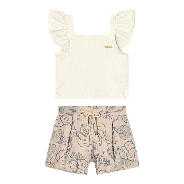 O Conjunto Colorittá é composto por blusa e short em malha canelada mesclada. A blusa possui mangas curtas com delicados babados, enquanto o short conta com elástico no cós e detalhes em pregas. Além disso, sua estampa com folhas tropicais em cores suaves traz a essência leve da estação. Ideal para momentos casuais com a família e amigos, invista nesse conjunto para garantir um toque de sofisticação no dia a dia das meninas!Detalhes da peça: • Conjunto composto por blusa e short • Feito em malha canelada mesclada • Possui mangas curtas com babados • Elástico no cós • Estampa com folhagens tropicais • Ideal para momentos casuais com família e amigos
