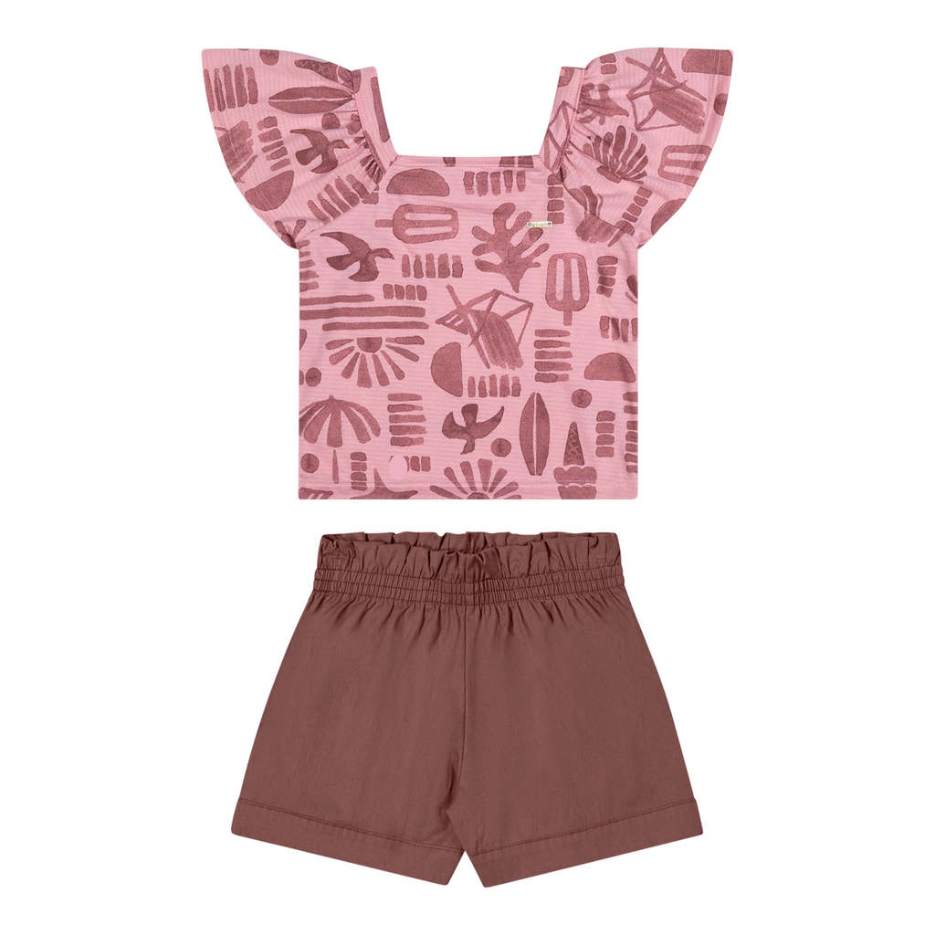 O Conjunto Elian é composto por blusa em malha trabalhada e short em tricoline. A blusa possui mangas curtas amplas com franzido e decote quadrado, além de estampa em toda a peça com desenhos que lembram carimbos de elementos tropicais. Já o short clochard conta com elástico no cós, proporcionando conforto para todos os momentos. Ideal para passeios ao ar livre, esse look leve e divertido é a escolha certa para o guarda-roupa infantil. Aposte!Detalhes da peça: • Conjunto composto por blusa e short • Feito em malha trabalhada e tricoline • Mangas curtas amplas • Estampa com elementos tropicais em efeito carimbo • Elástico no cós • Ideal para passeios ao ar livre