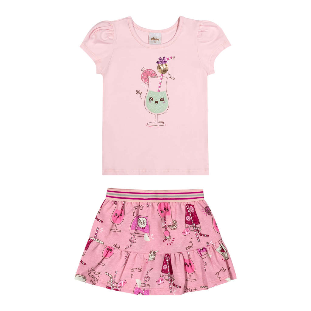 O Conjunto Elian é composto por blusa e short saia em cotton leve. A blusa possui mangas curtas com um leve franzido e estampa lúdica com detalhes em glitter, além de bordado com lantejoula para um brilho especial. Já o short saia conta com elástico colorido no cós, estampa combinando com a blusa e babado, trazendo movimento e volume à peça. Perfeito para ocasiões descontraídas e passeios em dias ensolarados, esse visual leve e encantador é a escolha certa para quem ama se divertir com estilo!Detalhes da peça: • Conjunto composto por blusa e short saia • Feito em cotton leve • Possui mangas curtas com franzidos • Estampa de sucos de frutas • Possui detalhes em glitter e bordado com lantejoula • Elástico colorido no cós • Ideal para passeios