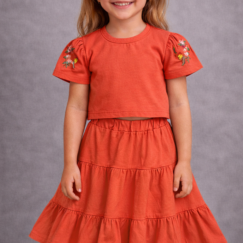 Conjunto Infantil Menina Cropped + Saia Algodão - Bordado na Manga - Confortável e Soltinho
