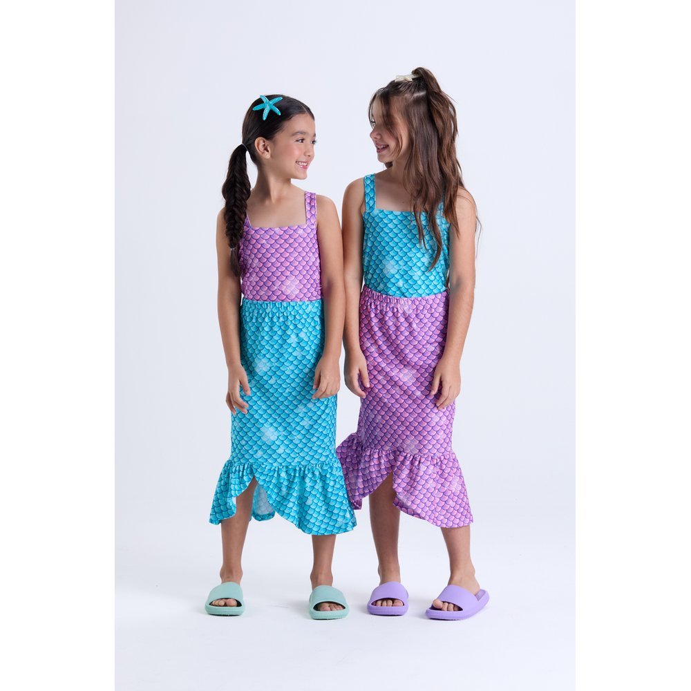Prepare-se para encantar com esse conjunto que é puro charme! O Conjunto Infantil Feminino Verão Sereia é composto por uma linda regata cropped e uma estilosa saia sereia com babado na barra, ambos em tecido poliplex sublimado, que garante leveza, conforto e um caimento incrível. Disponível em duas combinações mágicas: Top roxo com saia verde, e Top verde com saia roxa. A saia sereia com babados na barra traz movimento e um toque encantador, enquanto o cropped fresquinho deixa a combinação ainda mais moderna para os dias quentes. Conjunto respirável, fresquinho e que se adequa perfeitamente ao corpo, ideal para curtir o verão com estilo e conforto! Tamanhos: 2 ao 14. Composição: 96% poliéster | 4% elastano . Destaques: Tecido macio e confortável. Modelagem moderna e estilosa. Versátil para qualquer ocasião. Perfeito para um look encantador e prático.