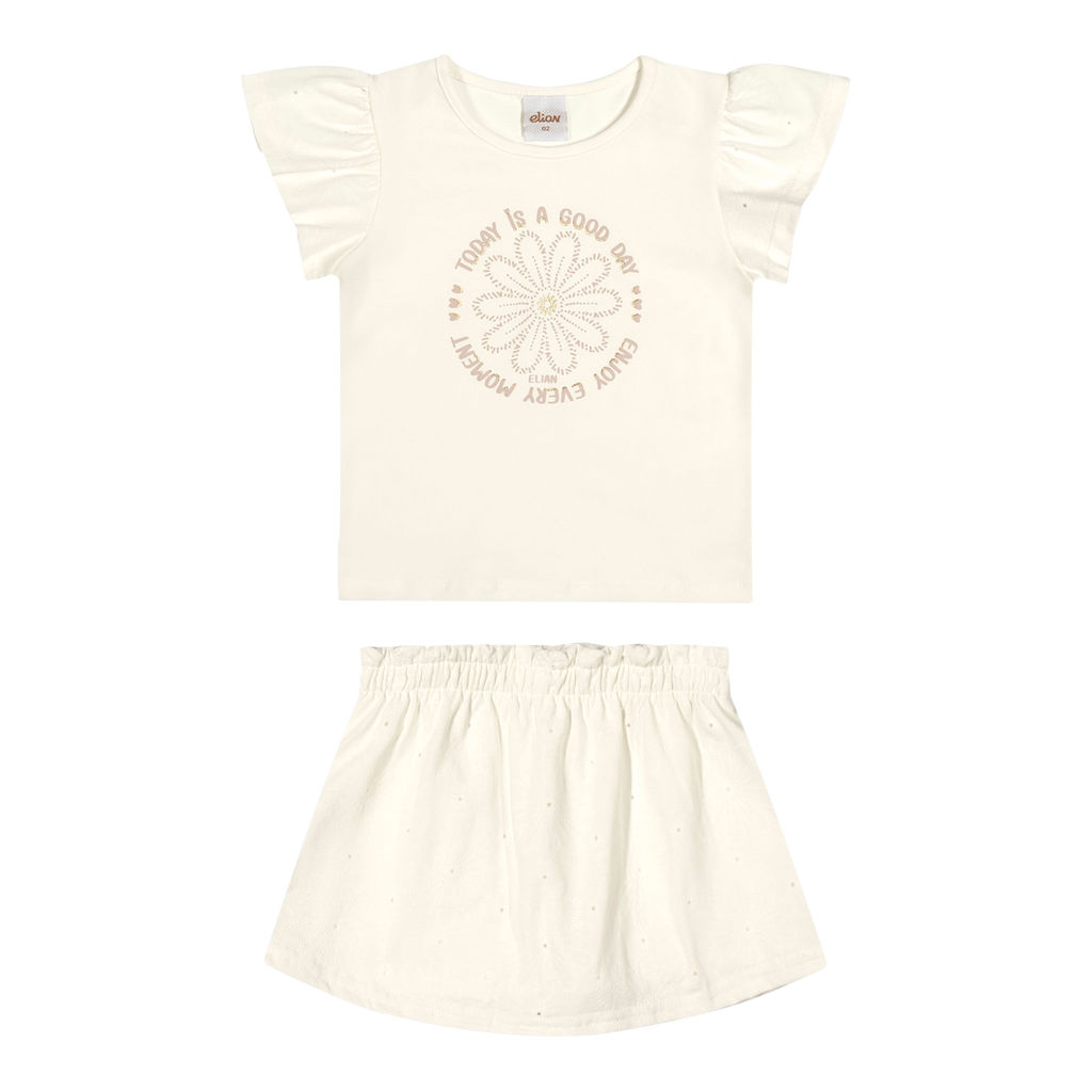 O Conjunto Elian é composto por blusa em cotton leve e saia em malha devorê. A blusa possui mangas curtas amplas e uma delicada estampa de flor, além de detalhes em puff e brilho para um charme extra. Já a saia conta com elástico no cós e short interno, ideal para proporcionar conforto em cada movimento. Invista nesse look leve e encantador para as pequenas aproveitarem momentos especiais com muito estilo!Detalhes da peça: • Conjunto composto por blusa e saia • Feito em cotton leve e malha devorê • Estampa de flor com detalhes em puff e brilho • Elástico no cós • Possui short interno • Ideal para momentos especiais