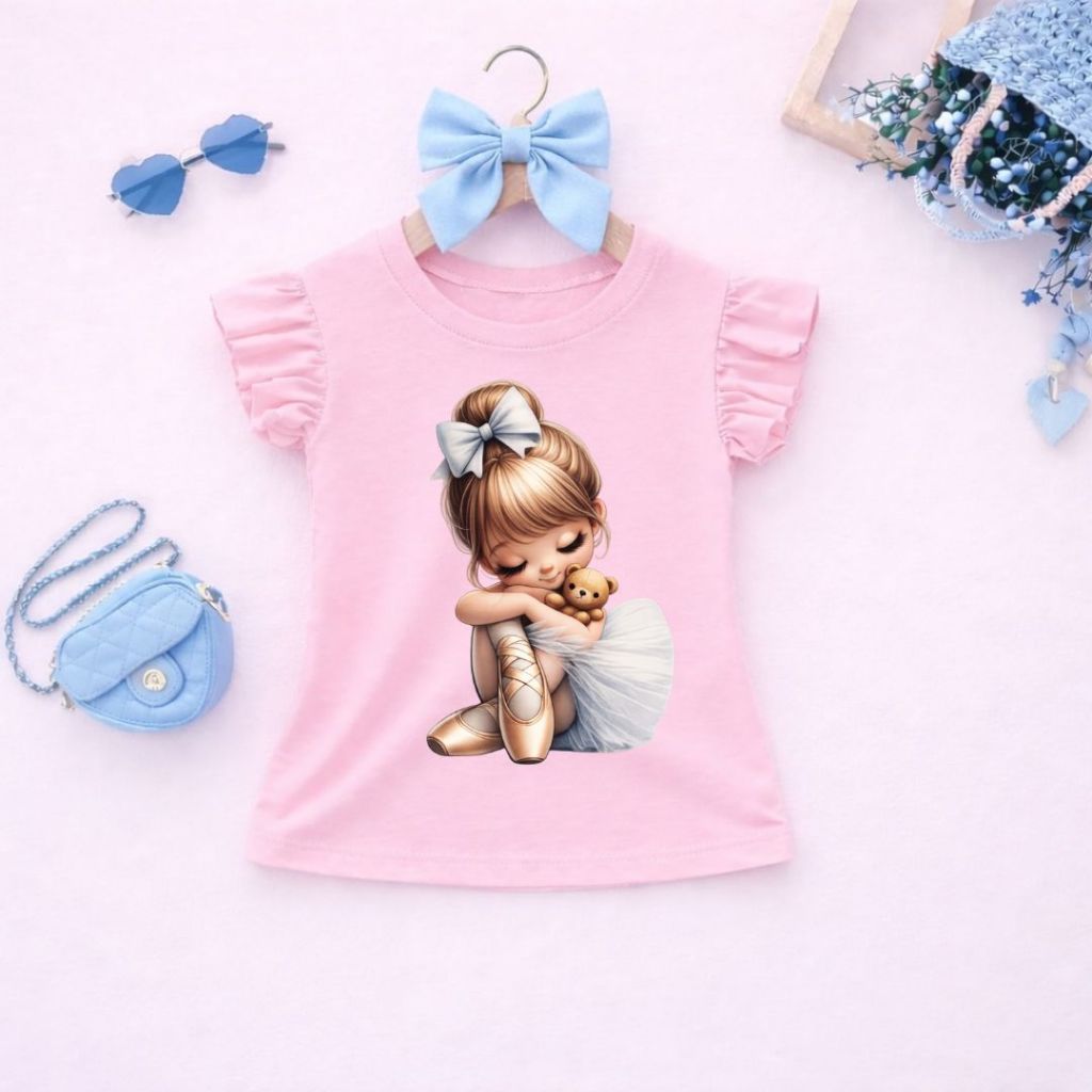 Conjunto Infantil Menina Fashion Trend Blusa Rosa Bebê com Babado- Bailarina e urso Fofa + Short Azul Bebê Look Infantil