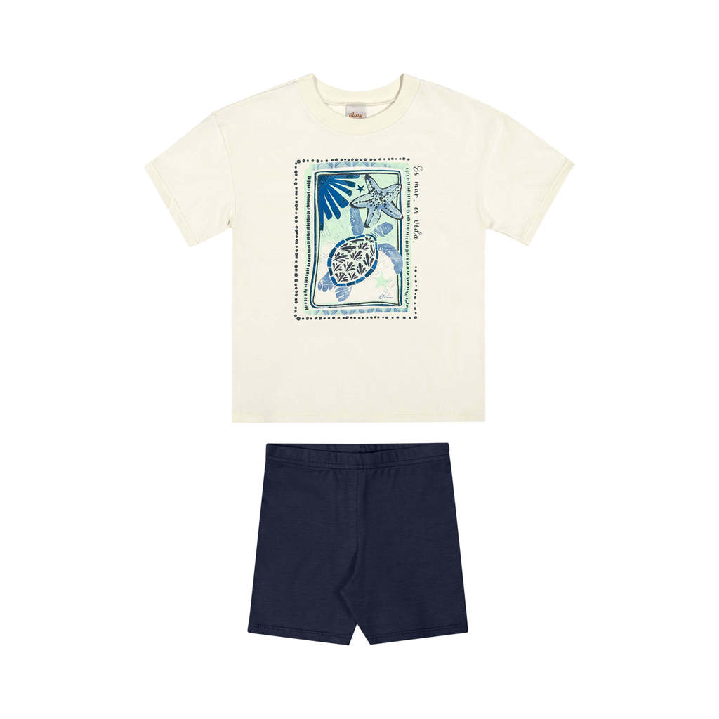 Escolha certa para aproveitar os dias com conforto e estilo, o Conjunto Elian é composto por blusa em meia malha e bermuda ciclista em cotton leve. A blusa possui mangas curtas com ombros deslocados e estampa frontal divertida de tartaruga e elementos do fundo do mar, além de detalhes em glitter para dar um charme extra à peça. Já a bermuda ciclista conta com elástico no cós, proporcionando liberdade de movimentos. Ideal para dia a dia ou passeios, aposte nesse conjunto cheio de personalidade!Detalhes da peça: • Conjunto composto por blusa e bermuda ciclista • Feito em meia malha e cotton leve • Possui mangas curtas com ombro deslocado • Possui estampa com elementos tropicais e glitter • Possui elástico no cós • Ideal para passeios e dia a dia