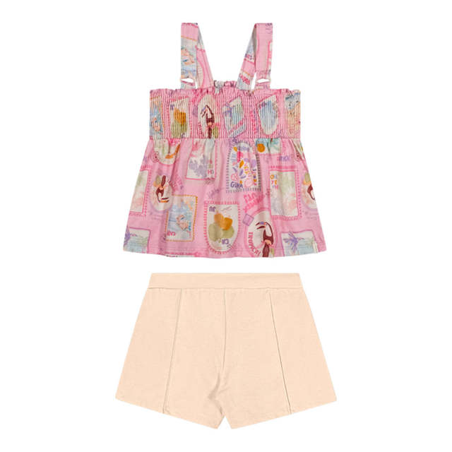 O Conjunto Elian é composto por regata em meia malha e short em moletinho dublado. A regata de alças possui recorte em lastex no busto e estampa inspirada em selos postais com elementos tropicais, trazendo um ar divertido e estiloso para o visual. Já o short liso conta com elástico no cós, complementando o look com conforto para todos os momentos. Ideal para momentos de lazer e passeios com a família ou amigos, esse conjunto fresquinho é item indispensável no guarda-roupa infantil. Aposte!Detalhes da peça: • Conjunto composto por regata e short • Feito em meia malha e moletinho dublado • Possui busto em lastex • Estampa inspirada em selos postais • Elástico no cós • Ideal para momentos de lazer e passeios